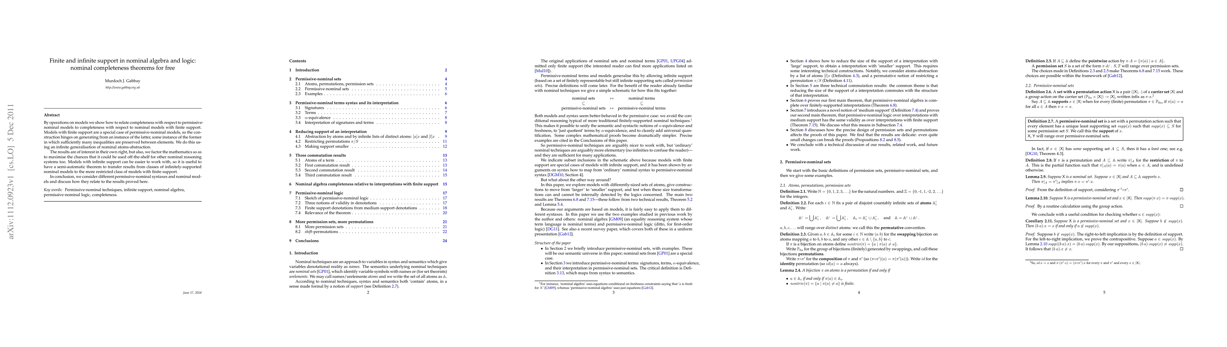 This paper establishes completeness theorems for nominal logic by linking permissive-nominal models with finite support models, using an infinite generalization of nominal atoms-abstraction. The results facilitate the transfer of theorems from infinite to finite support models, enhancing the utility of nominal reasoning systems.