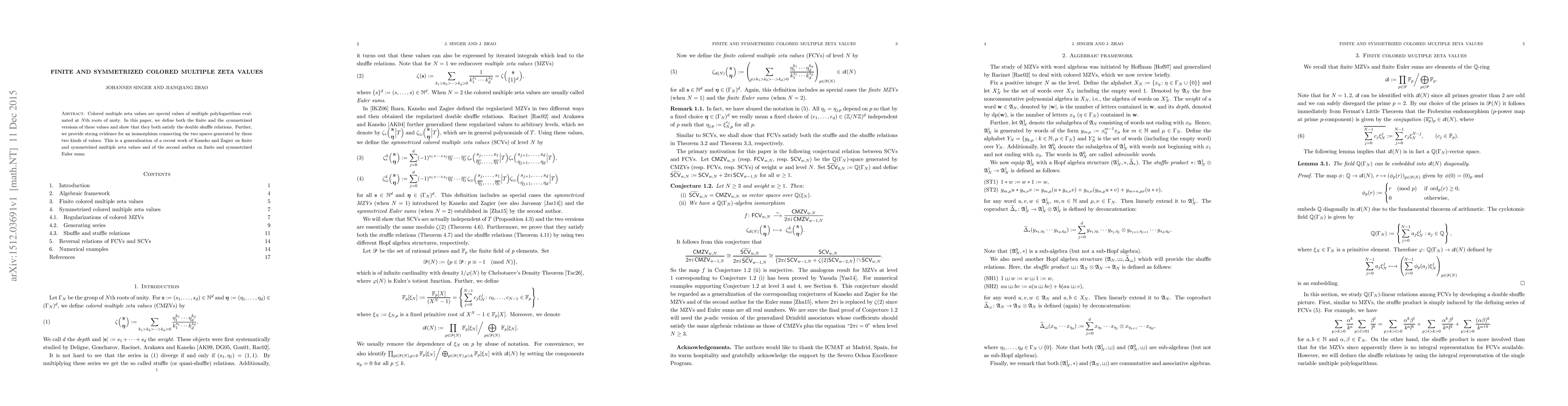 This paper defines finite and symmetrized colored multiple zeta values, demonstrating that both satisfy the double shuffle relations and proposes an isomorphism between the spaces generated by them, generalizing prior work on multiple zeta values and Euler sums.