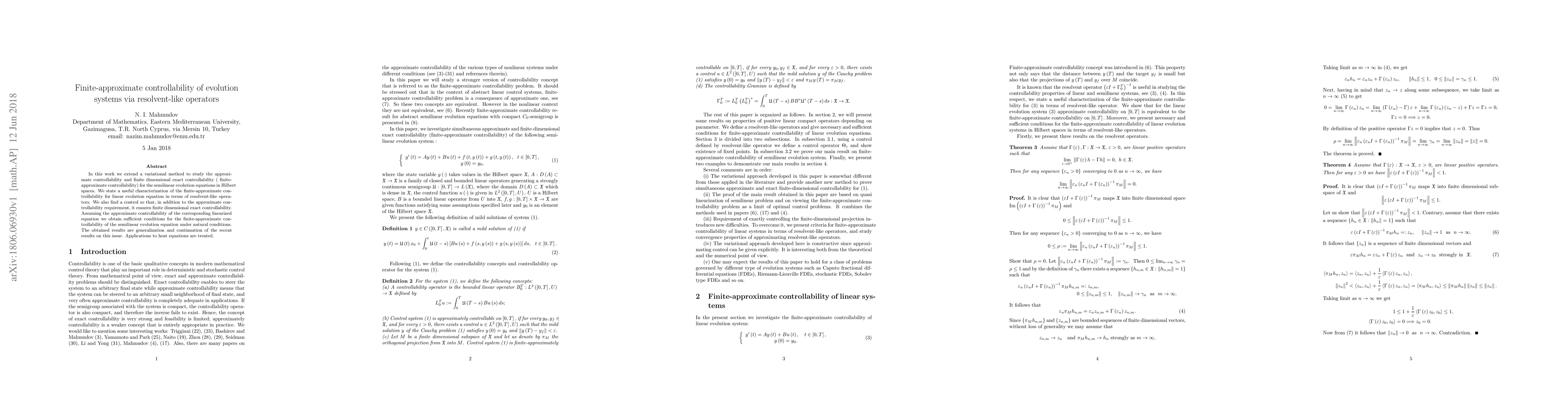 In this work we extend a variational method to study the approximate controllability and finite dimensional exact controllability ( finite-approximate controllability) for the semilinear evolution equations in Hilbert spaces. We state a useful characterization of the finite-approximate controllability for linear evolution equation in terms of resolvent-like operators. We also find a control so that, in addition to the approximate controllability requirement, it ensures finite dimensional exact controllability. Assuming the approximate controllability of the corresponding linearized equation we obtain sufficient conditions for the finite-approximate controllability of the semilinear evolution equation under natural conditions. The obtained results are generalization and continuation of the recent results on this issue. Applications to heat equations are treated.