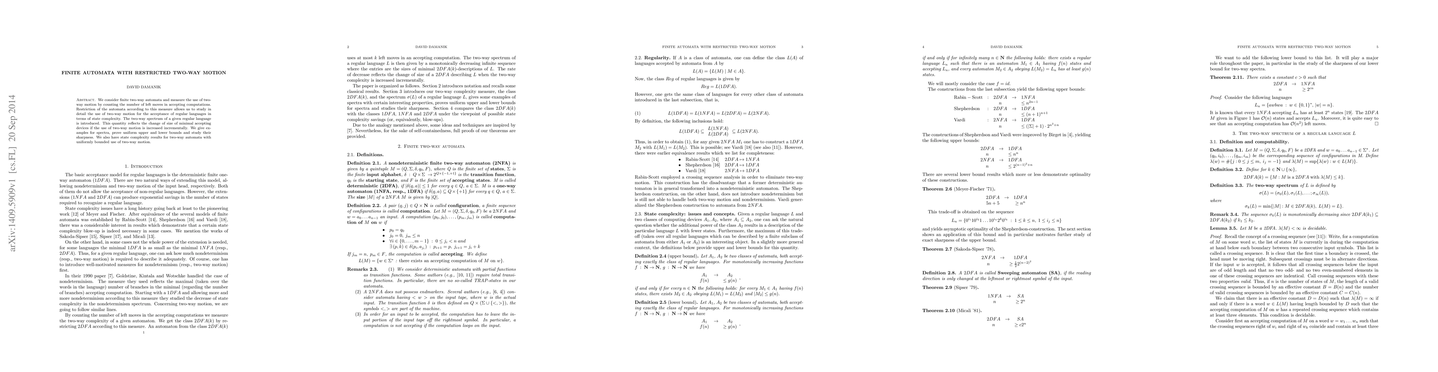 This paper investigates finite two-way automata by quantifying their two-way motion through left moves and explores how restricting this motion affects state complexity. It introduces the concept of the two-way spectrum for regular languages, providing bounds and examples to illustrate the impact of varying two-way motion on minimal accepting devices.