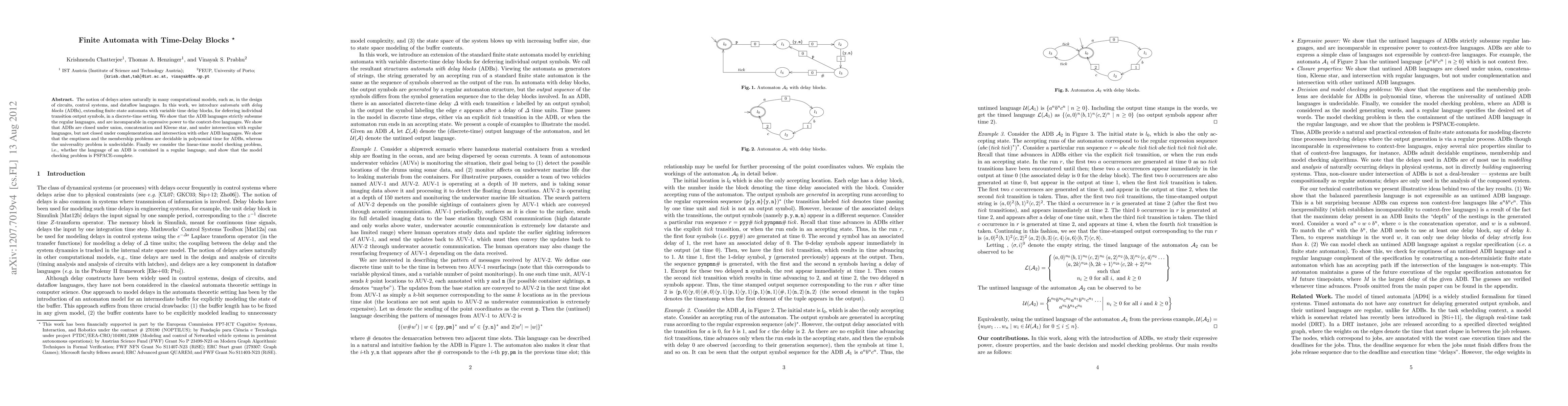 Researchers introduced automata with time-delay blocks (ADBs), which extend finite state automata to handle variable delays in transitions, showing they can recognize some but not all regular languages and have limitations on closure properties and model checking.