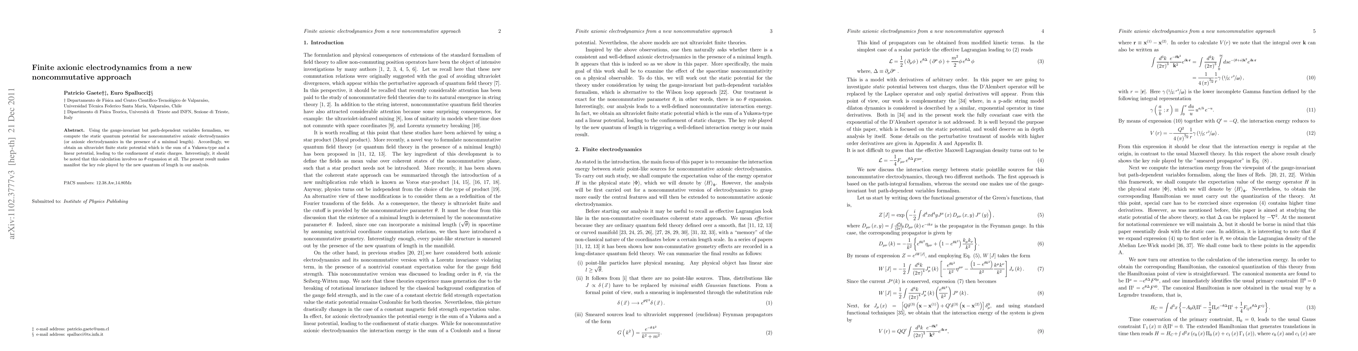 This paper employs a noncommutative approach to compute the static quantum potential for axionic electrodynamics, revealing an ultraviolet finite potential composed of a Yukawa-type and a linear potential, which facilitates the confinement of static charges without requiring a theta expansion. The study highlights the crucial role of the new quantum of length in the analysis.