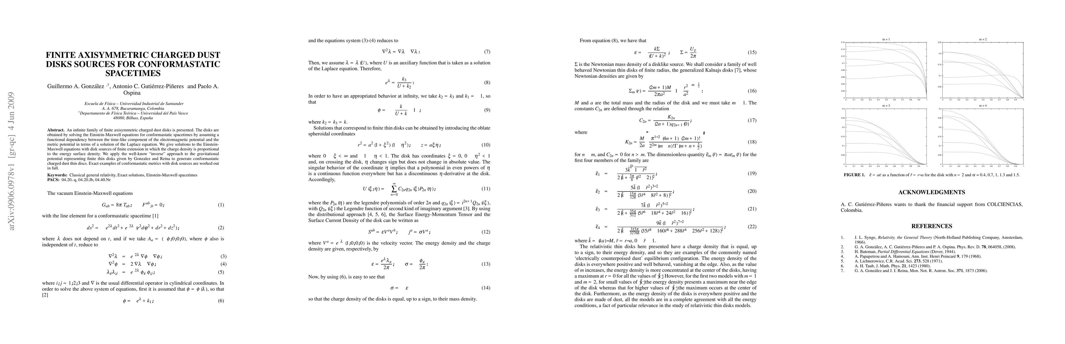 An infinite family of finite axisymmetric charged dust disks is presented. The disks are obtained by solving the Einstein-Maxwell equations for conformastatic spacetimes by assuming a functional dependency between the time-like component of the electromagnetic potential and the metric potential in terms of a solution of the Laplace equation. We give solutions to the Einstein-Maxwell equations with disk sources of finite extension in which the charge density is proportional to the energy surface density. We apply the well-know "inverse" approach to the gravitational potential representing finite thin disks given by Gonzalez and Reina to generate conformastatic charged dust thin discs. Exact examples of conformastatic metrics with disk sources are worked out in full.