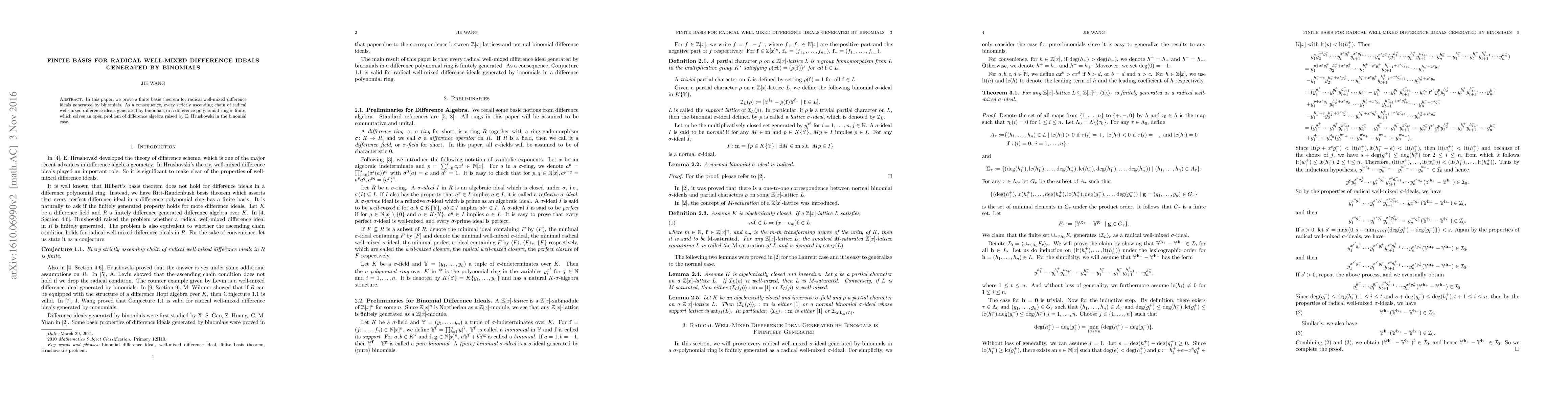 The paper proves a finite basis theorem for radical well-mixed difference ideals generated by binomials, resolving a question raised by E. Hrushovski in the binomial case and showing that every strictly ascending chain of such ideals is finite.