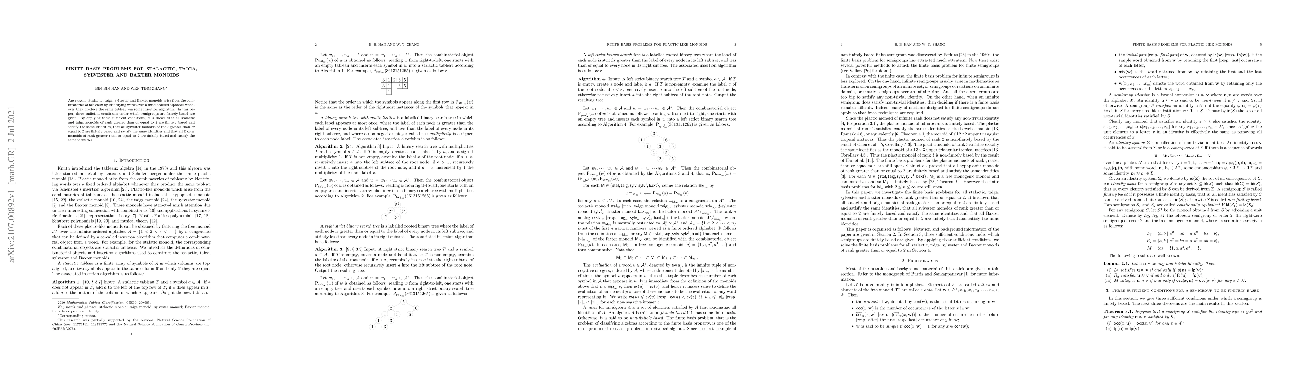 This paper identifies sufficient conditions for the finite basis of stalactic, taiga, sylvester, and Baxter monoids, which are derived from combinatorial tableau insertion algorithms. It concludes that all these monoids of rank greater than or equal to 2 are finitely based and share identical identities.