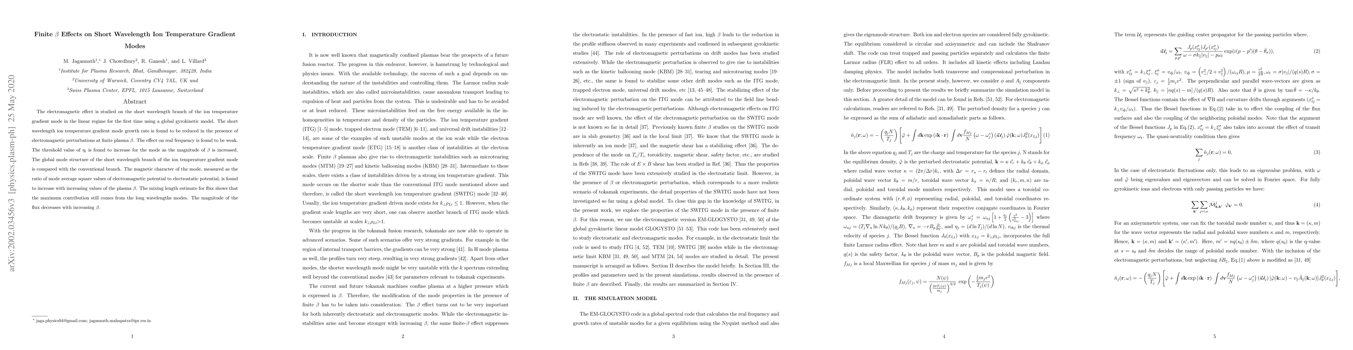 Research shows that finite beta effects reduce short wavelength ion temperature gradient mode growth rates, increase magnetic character with plasma beta, and decrease flux contribution.