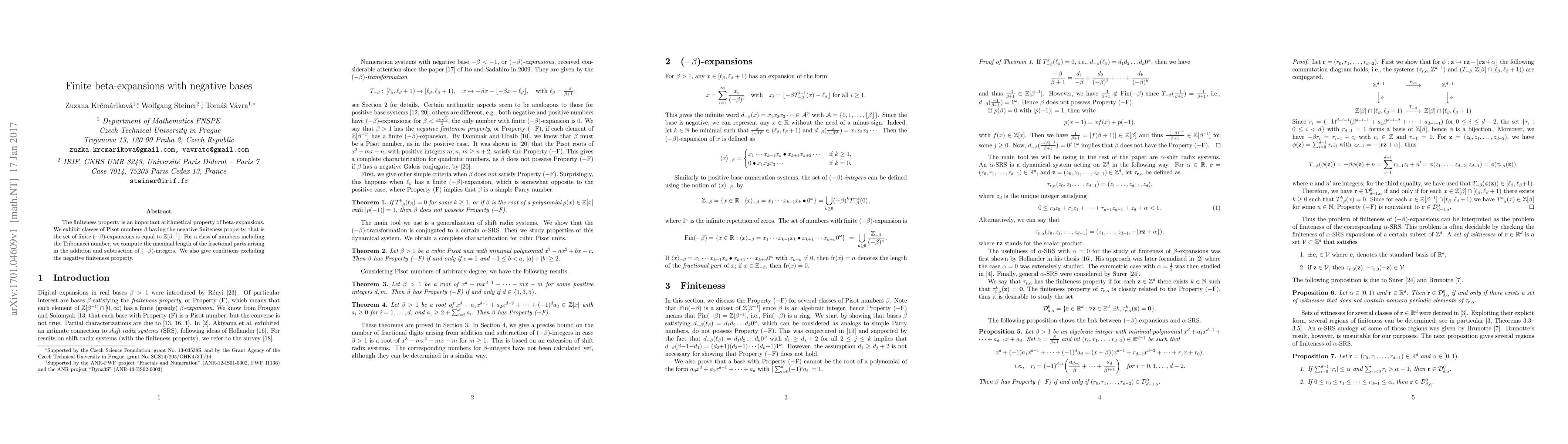 This paper explores the finiteness property of beta-expansions with negative bases, specifically focusing on Pisot numbers. It identifies classes of such numbers where the set of finite expansions equals $\mathbb{Z}[\beta^{-1}]$ and computes maximal lengths for fractional parts in operations involving $(-\beta)$-integers, excluding certain conditions that negate this property.