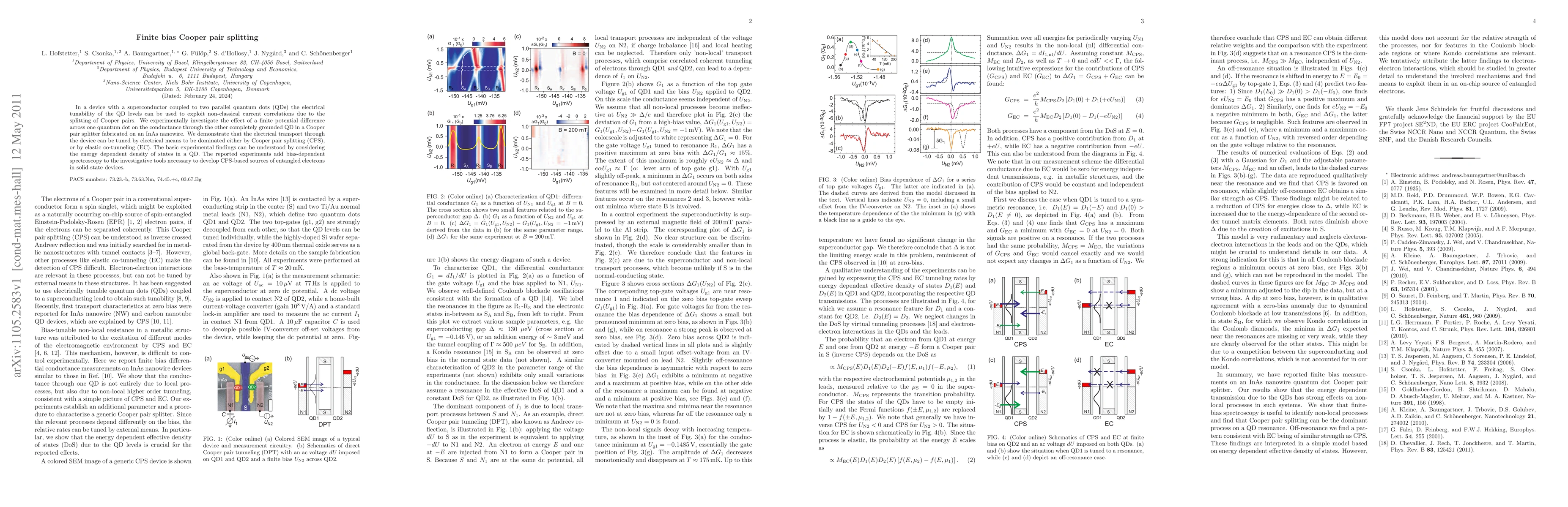 This research investigates a Cooper pair splitter in an InAs nanowire, demonstrating that a finite potential difference across one quantum dot can tune conductance through the other. The study reveals electrical tunability between Cooper pair splitting and elastic co-tunneling, providing insights into bias-dependent spectroscopy for developing entangled electron sources.