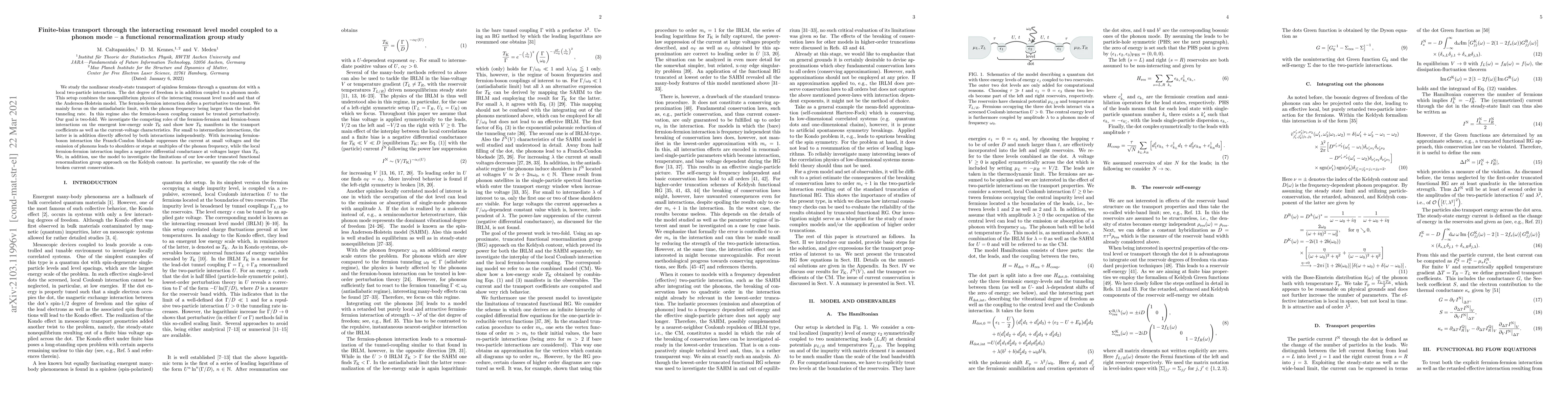 We study the nonlinear steady-state transport of spinless fermions through a quantum dot with a local two-particle interaction. The dot degree of freedom is in addition coupled to a phonon mode. This setup combines the nonequilibrium physics of the interacting resonant level model and that of the Anderson-Holstein model. The fermion-fermion interaction defies a perturbative treatment. We mainly focus on the antiadiabatic limit, with the phonon frequency being larger than the lead-dot tunneling rate. In this regime also the fermion-boson coupling cannot be treated perturbatively. Our goal is two-fold. We investigate the competing roles of the fermion-fermion and fermion-boson interactions on the emergent low-energy scale $T_{\rm K}$ and show how $T_{\rm K}$ manifests in the transport coefficients as well as the current-voltage characteristics. For small to intermediate interactions, the latter is in addition directly affected by both interactions independently. With increasing fermion-boson interaction the Franck-Condon blockade suppresses the current at small voltages and the emission of phonons leads to shoulders or steps at multiples of the phonon frequency, while the local fermion-fermion interaction implies a negative differential conductance at voltages larger than $T_{\rm K}$. We, in addition, use the model to investigate the limitations of our low-order truncated functional renormalization group approach on the Keldysh contour. In particular, we quantify the role of the broken current conservation.