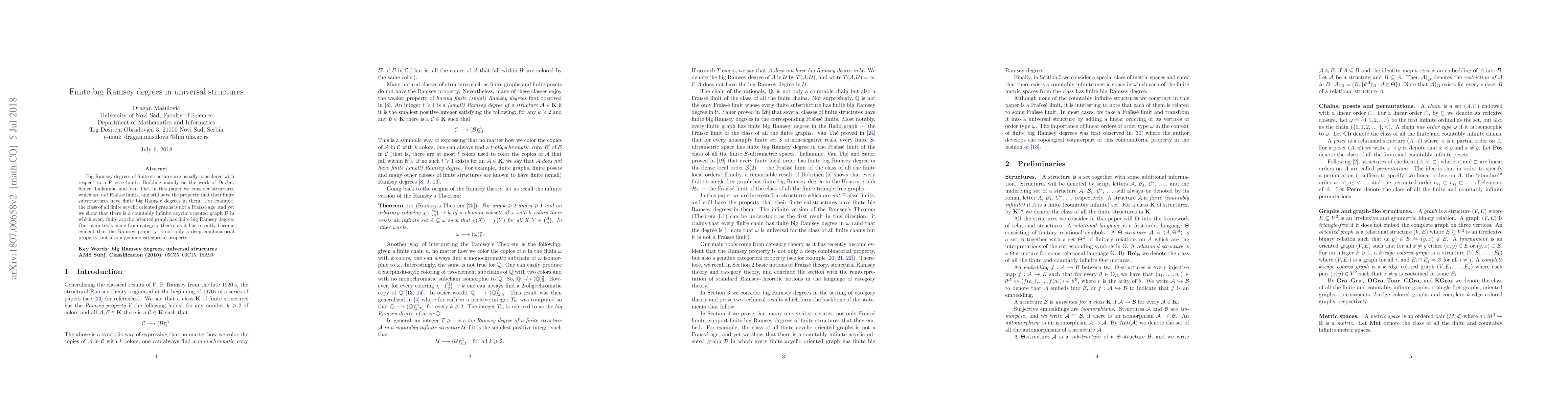 Big Ramsey degrees of finite structures are usually considered with respect to a Fra\"{i} ss\'e limit. Building mainly on the work of Devlin, Sauer, Laflamme and Van Th\'e, in this paper we consider structures which are not Fra\"{i} ss\'e limits, and still have the property that their finite substructures have finite big Ramsey degrees in them. For example, the class of all finite acyclic oriented graphs is not a Fra\"{i} ss\'e class, and yet we show that there is a countably infinite acyclic oriented graph in which every finite acyclic oriented graph has finite big Ramsey degree. Our main tools come from category theory as it has recently become evident that the Ramsey property is not only a deep combinatorial property, but also a genuine categorical property.