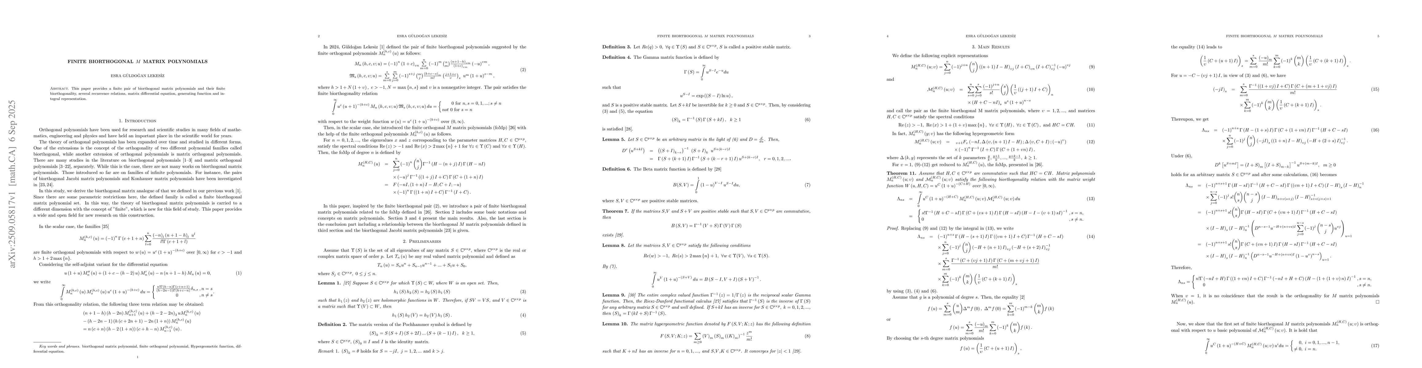 This paper provides a finite pair of biorthogonal matrix polynomials and their finite biorthogonality, several recurrence relations, matrix differential equation, generating function and integral representation.