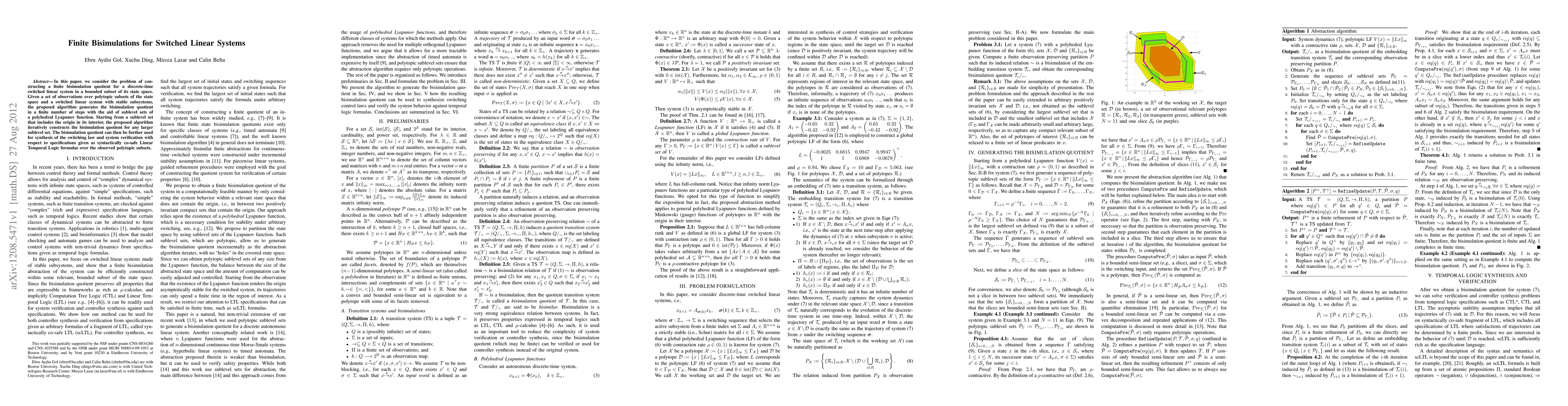 Researchers developed a method to construct finite bisimulations for switched linear systems in a bounded subset of its state space, enabling the synthesis of switching laws and system verification with respect to specifications given as Linear Temporal Logic formulas.
