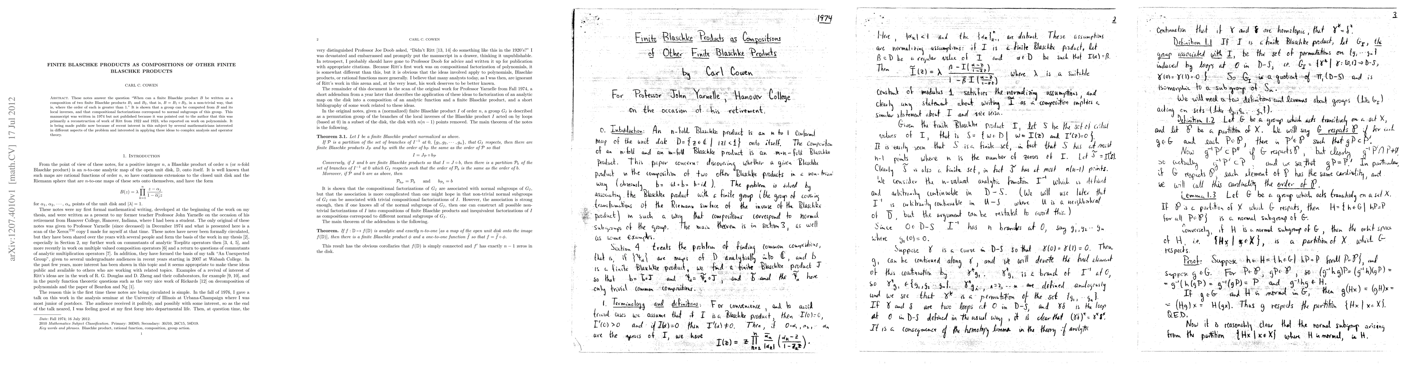 A 1974 research paper explores how finite Blaschke products can be expressed as compositions of other finite Blaschke products, showing a connection to normal subgroups of a computed group.