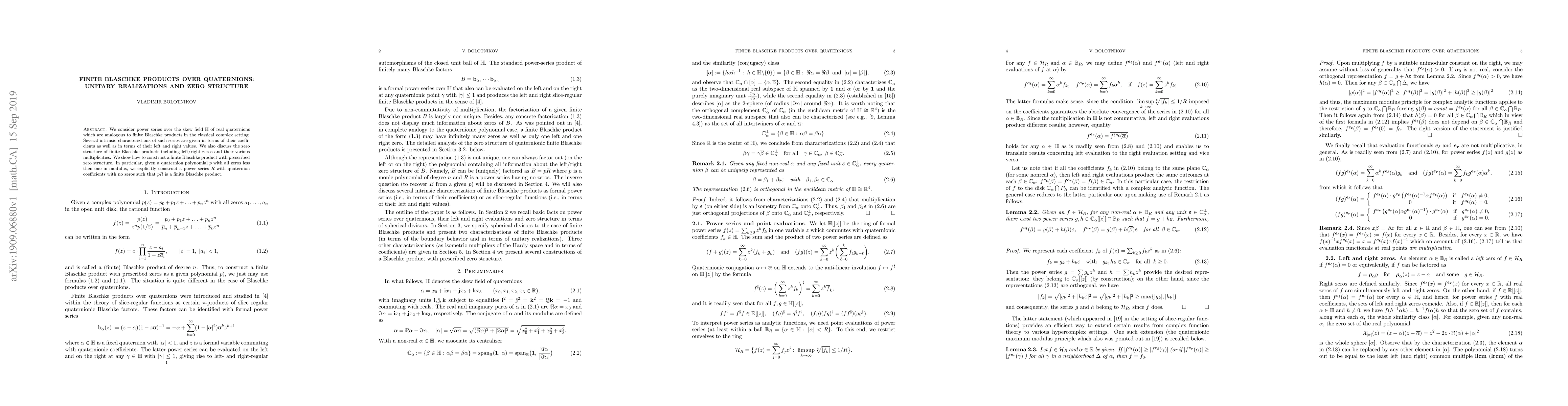 This paper explores finite Blaschke products over the quaternions, providing characterizations based on their coefficients and values, and discussing their zero structure, including left/right zeros and multiplicities. It also constructs a finite Blaschke product with a specified zero structure by combining a given quaternion polynomial with a power series to achieve the desired properties.
