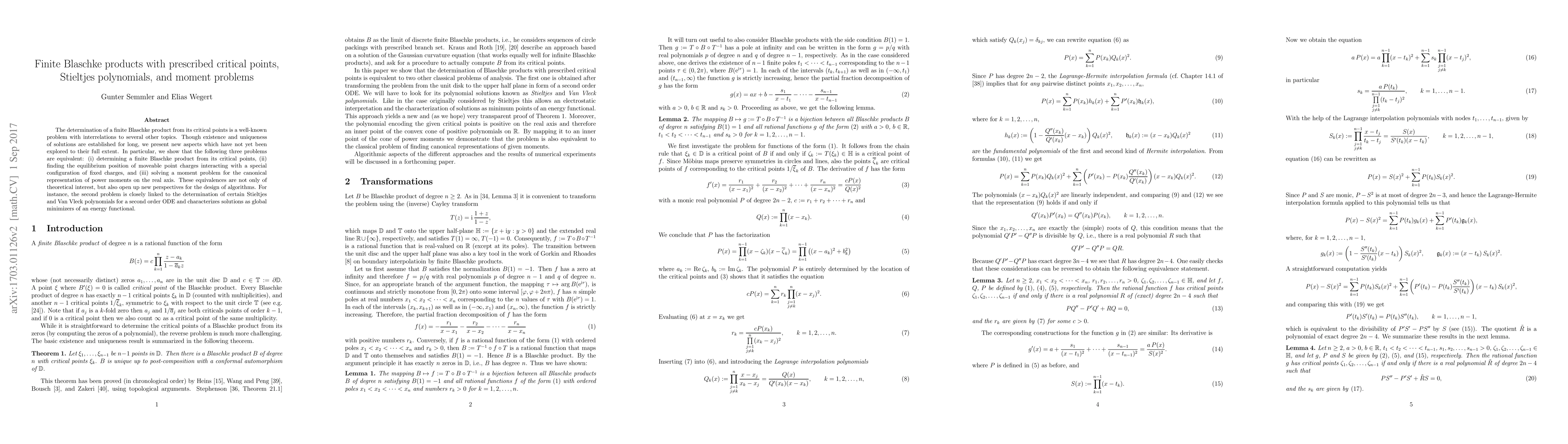 The determination of a finite Blaschke product from its critical points is a well-known problem with interrelations to other topics. Though existence and uniqueness of solutions are established for long, we present several new aspects which have not yet been explored to their full extent. In particular, we show that the following three problems are equivalent: (i) determining a finite Blaschke product from its critical points, (ii) finding the equilibrium position of moveable point charges interacting with a special configuration of fixed charges, (iii) solving a moment problem for the canonical representation of power moments on the real axis. These equivalences are not only of theoretical interest, but also open up new perspectives for the design of algorithms. For instance, the second problem is closely linked to the determination of certain Stieltjes and Van Vleck polynomials for a second order ODE and allows the description of solutions as global minimizers of an energy functional.