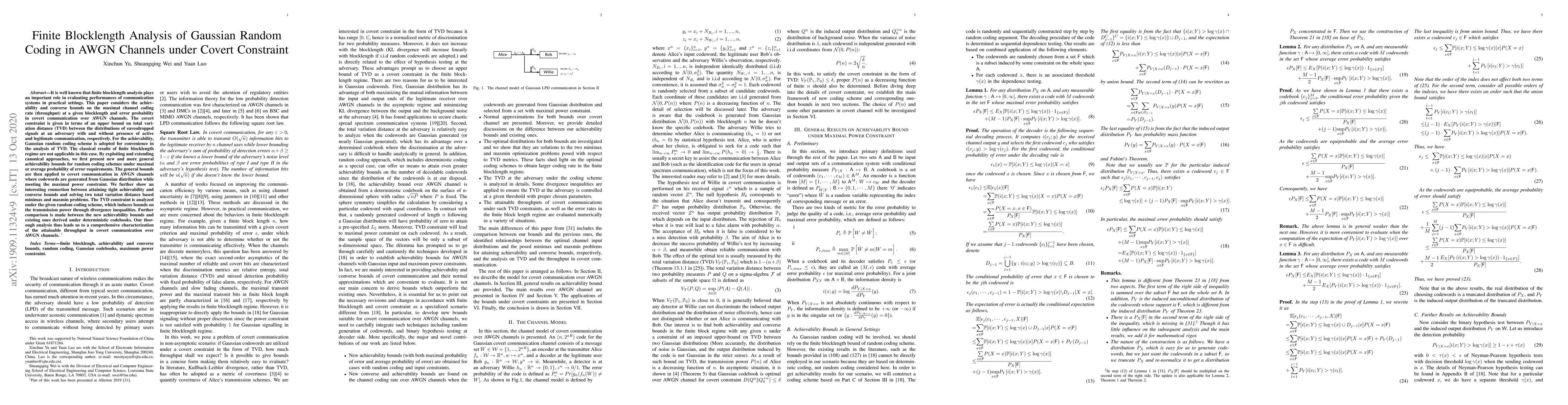 This paper considers the achievability and converse bounds on the maximal channel coding rate at a given blocklength and error probability over AWGN channels. The problem stems from covert communication with Gaussian codewords. By re-visiting [18], we first present new and more general achievability bounds for random coding schemes under maximal or average probability of error requirements. Such general bounds are then applied to covert communication in AWGN channels where codewords are generated from Gaussian distribution while meeting the maximal power constraint. Further comparison is made between the new achievability bounds and existing one with deterministic codebooks.