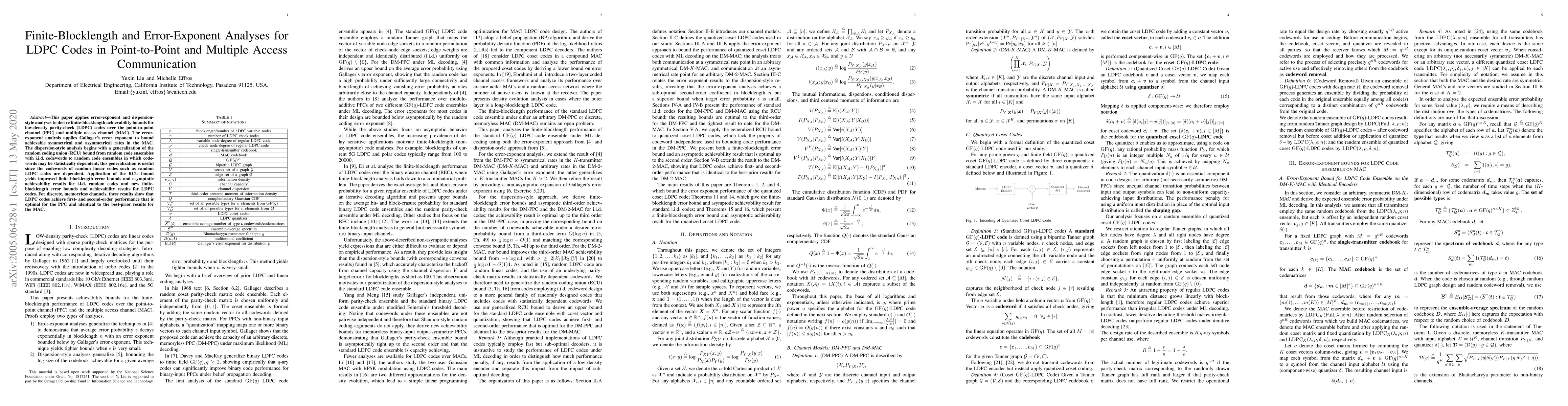 This paper derives finite-blocklength achievability bounds for LDPC codes using error-exponent and dispersion-style analyses, showing optimal first- and second-order performance for point-to-point and multiple access channels. It generalizes the random coding union bound for dependent codewords, yielding improved error bounds and achievability results.