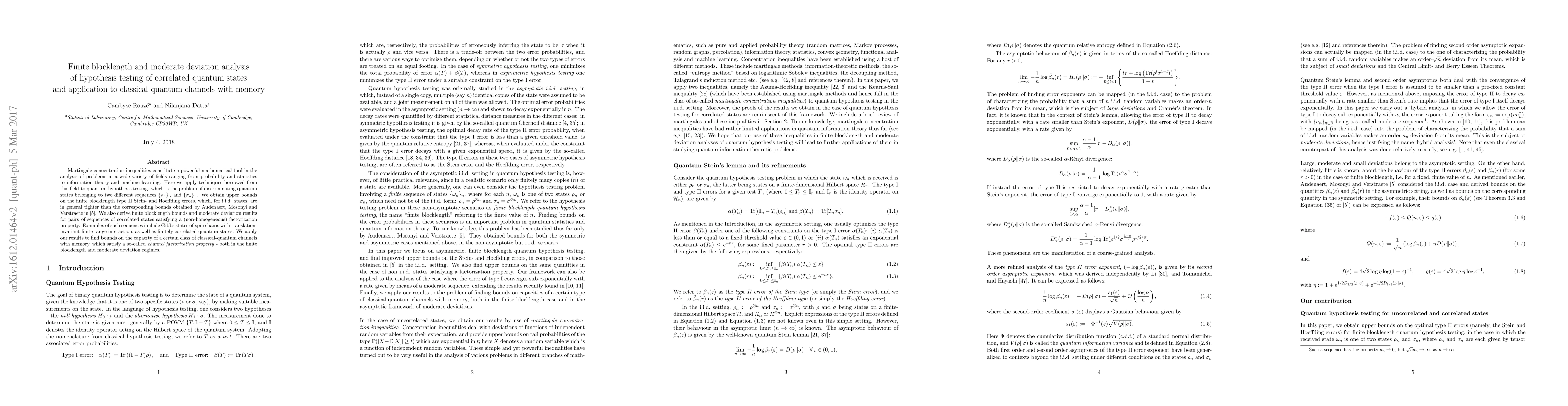 This paper applies martingale concentration inequalities to analyze quantum hypothesis testing for correlated quantum states, deriving tighter finite blocklength error bounds compared to previous methods. It also extends these results to correlated state sequences and applies them to determine the capacity of classical-quantum channels with memory.