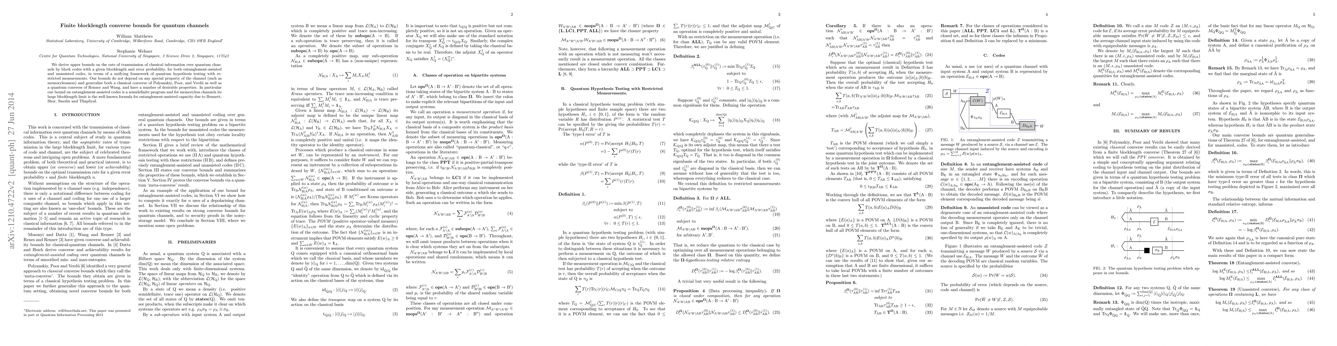 We derive upper bounds on the rate of transmission of classical information over quantum channels by block codes with a given blocklength and error probability, for both entanglement-assisted and unassisted codes, in terms of a unifying framework of quantum hypothesis testing with restricted measurements. Our bounds do not depend on any special property of the channel (such as memorylessness) and generalise both a classical converse of Polyanskiy, Poor, and Verd\'{u} as well as a quantum converse of Renner and Wang, and have a number of desirable properties. In particular our bound on entanglement-assisted codes is a semidefinite program and for memoryless channels its large blocklength limit is the well known formula for entanglement-assisted capacity due to Bennett, Shor, Smolin and Thapliyal.