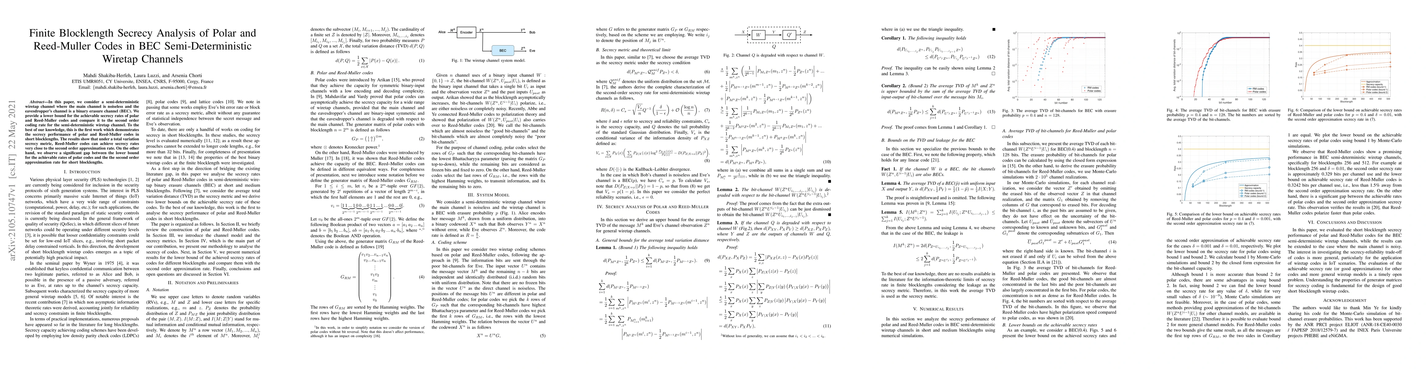 In this paper, we consider a semi-deterministic wiretap channel where the main channel is noiseless and the eavesdropper's channel is a binary erasure channel (BEC). We provide a lower bound for the achievable secrecy rates of polar and Reed Muller codes and compare it to the second order coding rate for the semi-deterministic wiretap channel. To the best of our knowledge, this is the first work which demonstrates the secrecy performance of polar and Reed-Muller codes in short blocklengths. The results show that under a total variation secrecy metric, Reed Muller codes can achieve secrecy rates very close to the second order approximation rate. On the other hand, we observe a significant gap between the lower bound for the achievable rates of polar codes and the the second order approximation rate for short blocklengths.
