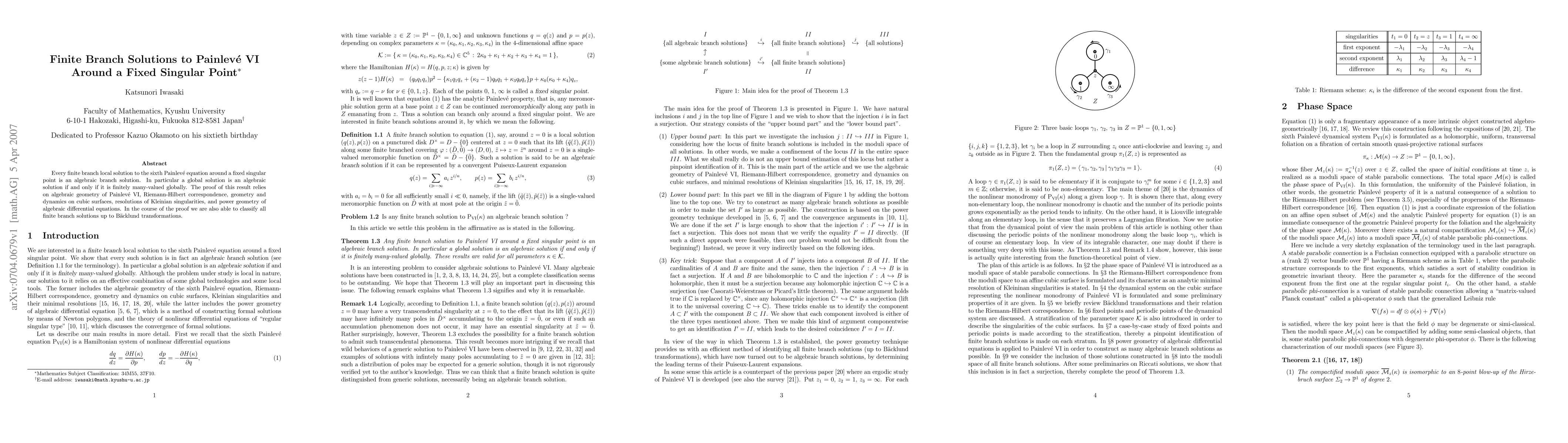 This paper demonstrates that finite branch solutions to the sixth Painleve equation around a fixed singular point are algebraic. The proof employs advanced techniques from algebraic geometry, Riemann-Hilbert correspondence, and the dynamics on cubic surfaces, leading to a classification of these solutions up to Backlund transformations.