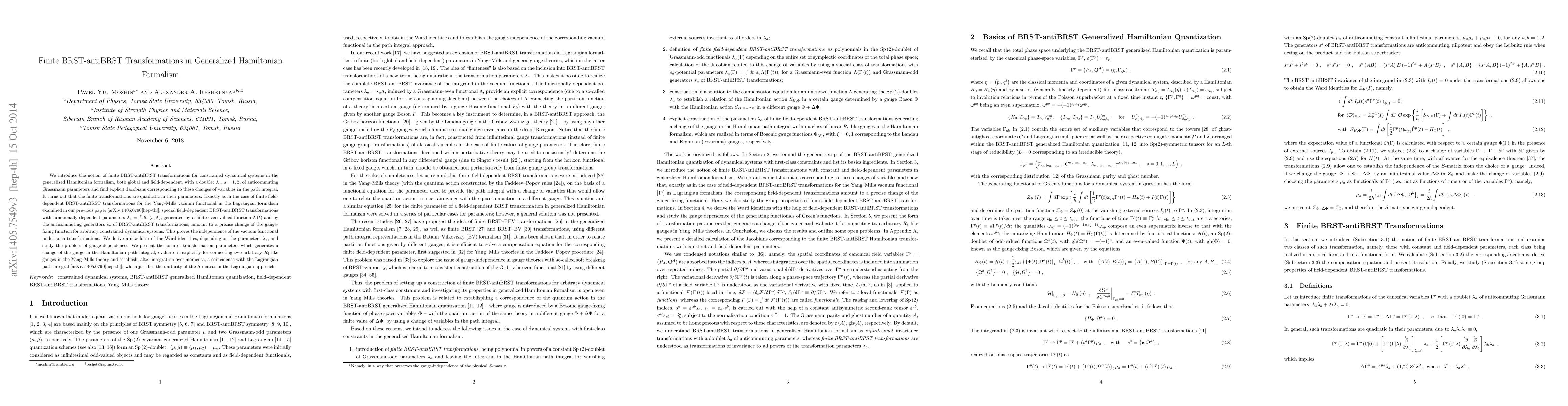 This paper introduces finite BRST-antiBRST transformations in the generalized Hamiltonian formalism, deriving explicit Jacobians and showing their quadratic dependence on parameters. These transformations change gauge-fixing functions, proving the independence of the vacuum functional and establishing a new form of Ward identities, which align with results from the Lagrangian formalism, supporting the unitarity of the S-matrix.