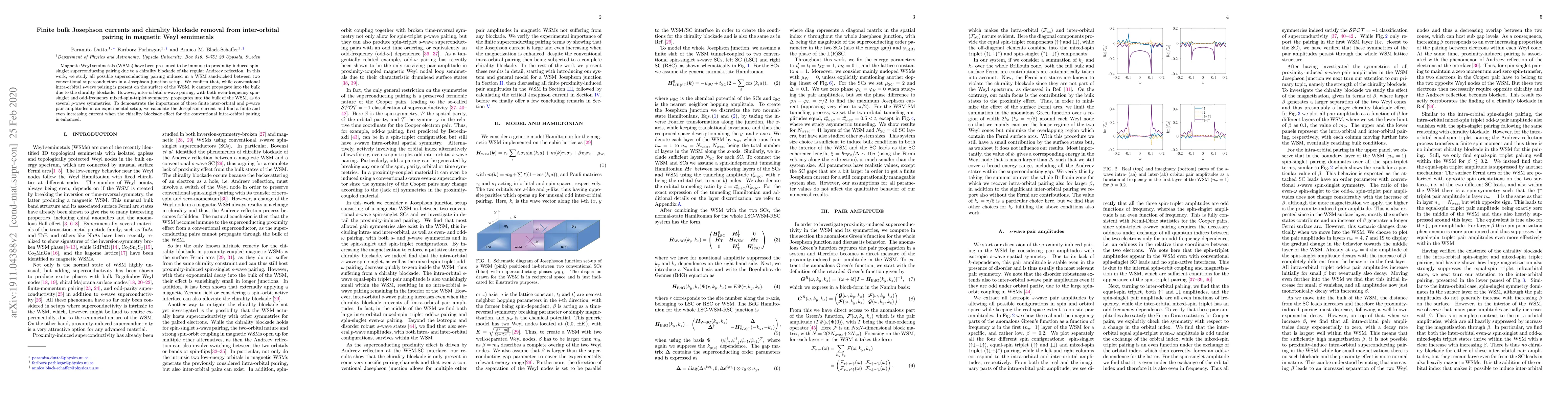 Magnetic Weyl semimetals (WSMs) have been presumed to be immune to proximity-induced spin-singlet superconducting pairing due to a chirality blockade of the regular Andreev reflection. In this work we study all possible superconducting pairing induced in a WSM sandwiched between two conventional superconductors in a Josephson junction setup. We confirm that, while conventional intra-orbital $s$-wave pairing is present on the surface of the WSM, it cannot propagate into the bulk due to the chirality blockade. However, inter-orbital $s$-wave pairing, with both even-frequency spin-singlet and odd-frequency mixed-spin triplet symmetry, propagates into the bulk of the WSM, as do several $p$-wave symmetries. To demonstrate the importance of these finite inter-orbital and $p$-wave pair amplitudes in an experimental setup, we calculate the Josephson current and find a finite and even increasing current when the chirality blockade effect for the conventional intra-orbital pairing is enhanced.