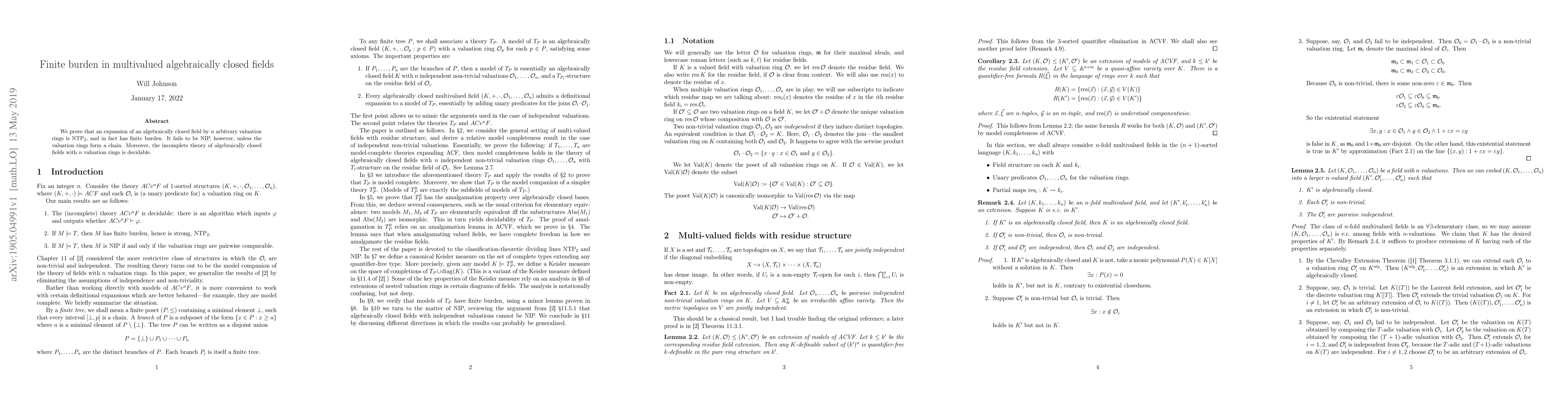 The paper proves that expanding algebraically closed fields by $n$ valuation rings results in a theory that is NTP$_2$ and has finite burden, but fails to be NIP unless the rings form a chain; additionally, the incomplete theory is decidable.