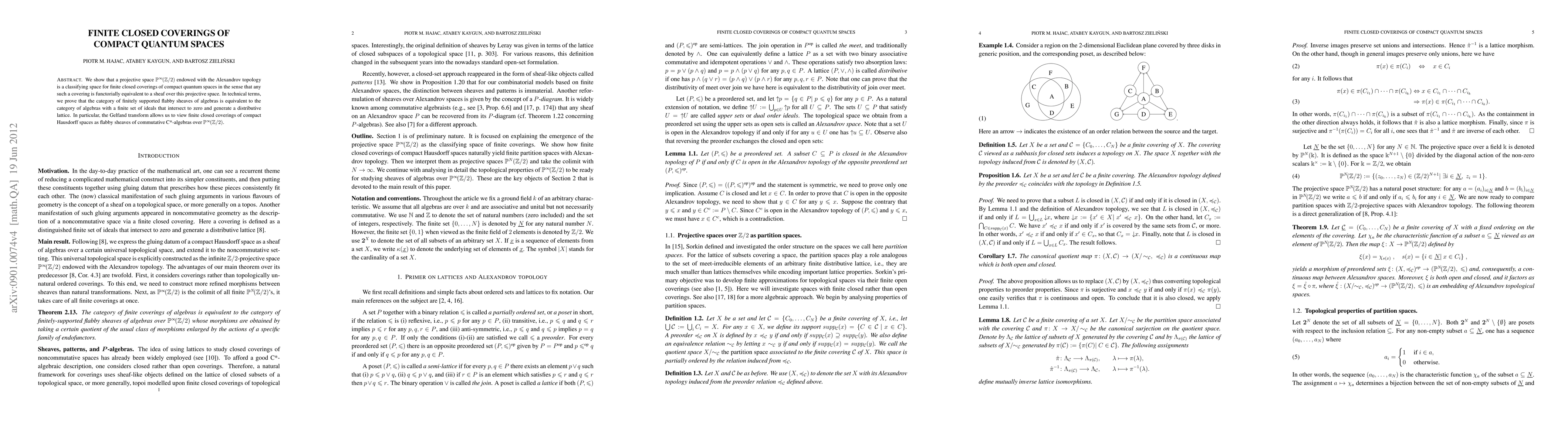 This paper demonstrates that the projective space P^\infty(Z/2) with Alexandrov topology classifies finite closed coverings of compact quantum spaces, establishing an equivalence between finitely supported flabby sheaves of algebras and algebras with a finite set of ideals forming a distributive lattice. The Gelfand transform enables viewing these coverings as flabby sheaves over P^\infty(Z/2).