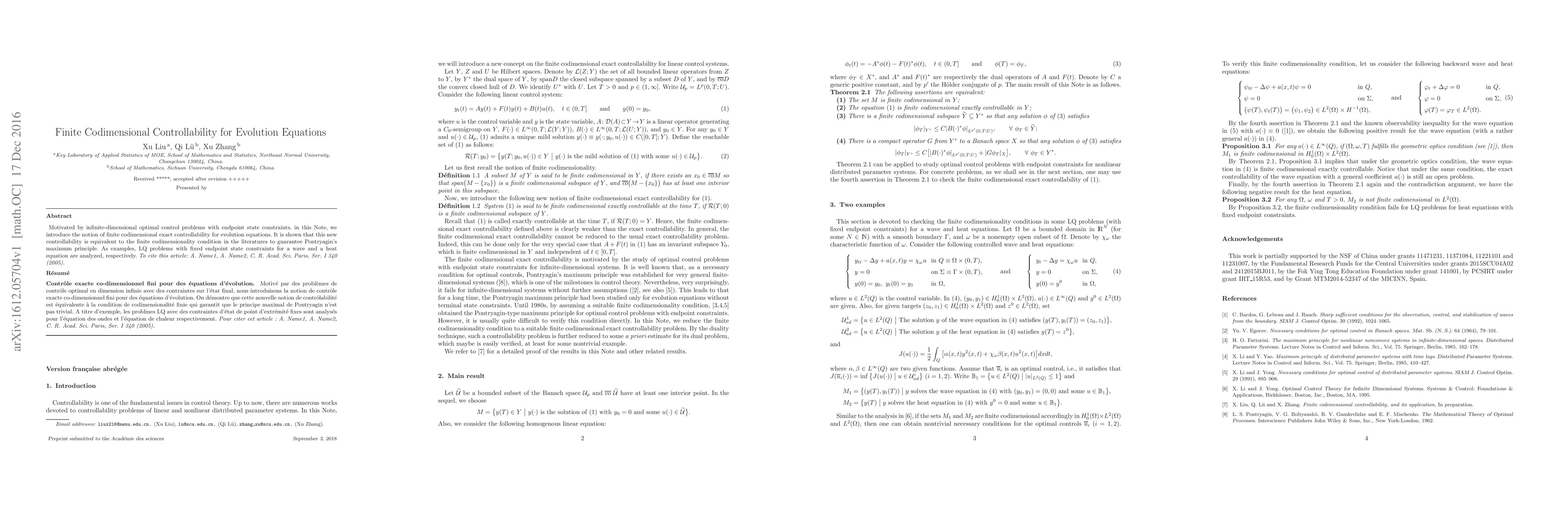 This paper introduces the concept of finite codimensional exact controllability for evolution equations, demonstrating its equivalence to the finite codimensionality condition needed to ensure Pontryagin's maximum principle. Examples include LQ problems with endpoint constraints for wave and heat equations.