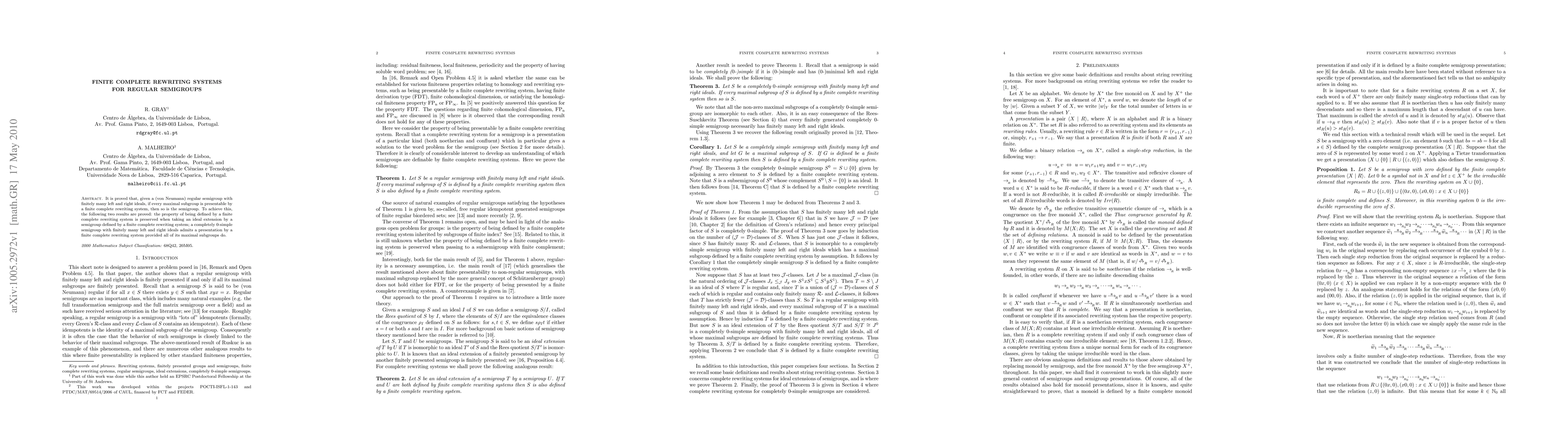 It is proved that, given a (von Neumann) regular semigroup with finitely many left and right ideals, if every maximal subgroup is presentable by a finite complete rewriting system, then so is the semigroup. To achieve this, the following two results are proved: the property of being defined by a finite complete rewriting system is preserved when taking an ideal extension by a semigroup defined by a finite complete rewriting system; a completely 0-simple semigroup with finitely many left and right ideals admits a presentation by a finite complete rewriting system provided all of its maximal subgroups do.