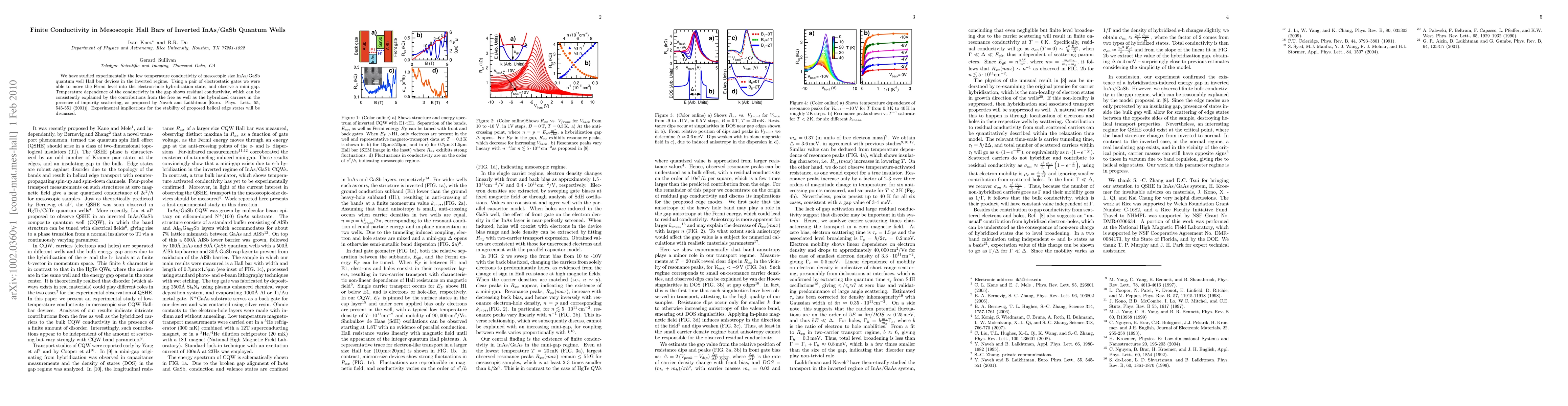 Researchers studied the conductivity of InAs/GaSb quantum well Hall bars at low temperatures, observing a mini gap that can be explained by contributions from free and hybridized carriers due to impurity scattering.