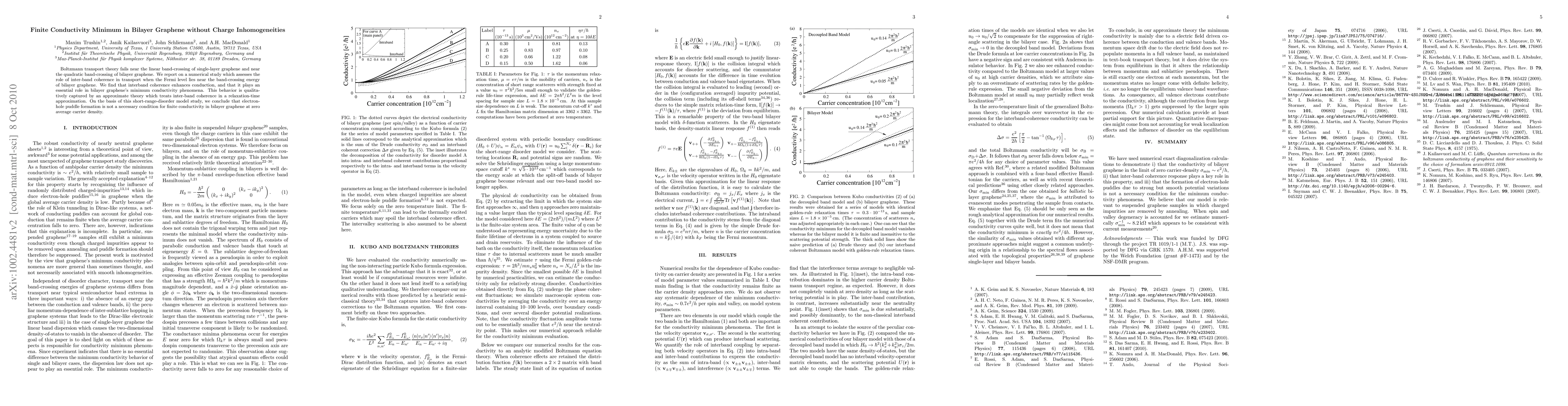 Boltzmann transport theory fails near the linear band-crossing of single-layer graphene and near the quadratic band-crossing of bilayer graphene. We report on a numerical study which assesses the role of inter-band coherence in transport when the Fermi level lies near the band-crossing energy of bilayer graphene. We find that interband coherence enhances conduction, and that it plays an essential role in graphene's minimum conductivity phenomena. This behavior is qualitatively captured by an approximate theory which treats inter-band coherence in a relaxation-time approximation. On the basis of this short-range-disorder model study, we conclude that electron-hole puddle formation is not a necessary condition for finite conductivity in graphene at zero average carrier density.