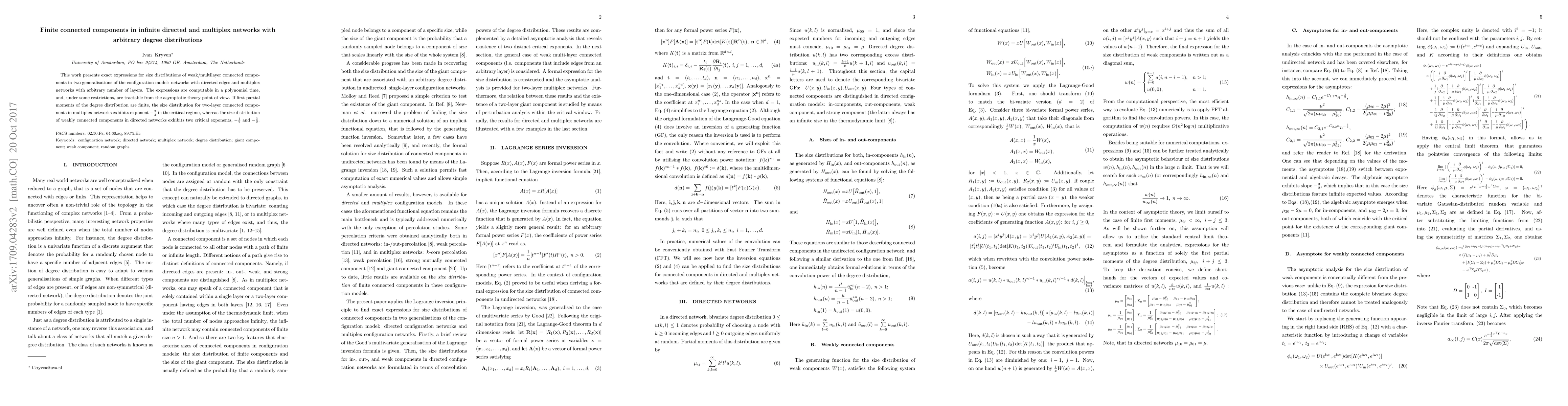 This work presents exact expressions for size distributions of weak/multilayer connected components in two generalisations of the configuration model: networks with directed edges and multiplex networks with arbitrary number of layers. The expressions are computable in a polynomial time, and, under some restrictions, are tractable from the asymptotic theory point of view. If first partial moments of the degree distribution are finite, the size distribution for two-layer connected components in multiplex networks exhibits exponent $-\frac{3}{2}$ in the critical regime, whereas the size distribution of weakly connected components in directed networks exhibits two critical exponents, $-\frac{1}{2}$ and $-\frac{3}{2}$.