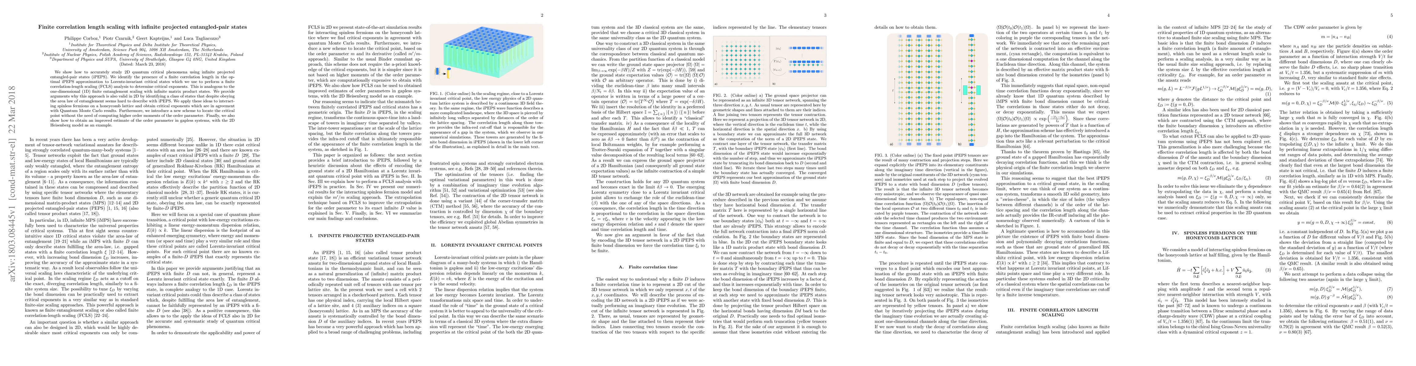This paper demonstrates the use of infinite projected entangled-pair states (iPEPS) to study 2D quantum critical phenomena, identifying a finite correlation length and performing finite correlation-length scaling (FCLS) to determine critical exponents. It introduces a new method to locate the critical point without higher order moments and provides an improved estimate of the order parameter in gapless systems.