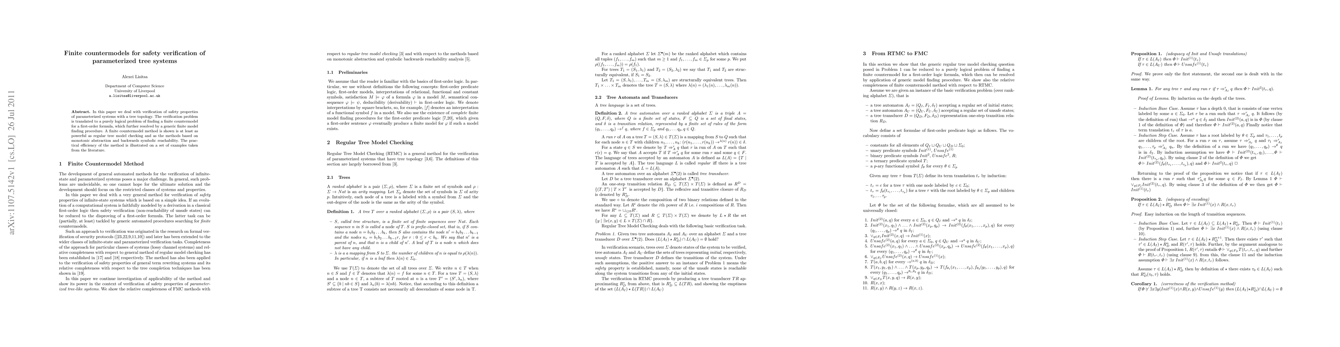 This paper presents a method for verifying safety properties of parameterized tree systems by finding finite countermodels for first-order formulas, demonstrating its effectiveness and efficiency through examples from the literature. The approach is shown to be at least as powerful as traditional tree model checking and other abstraction-based methods.