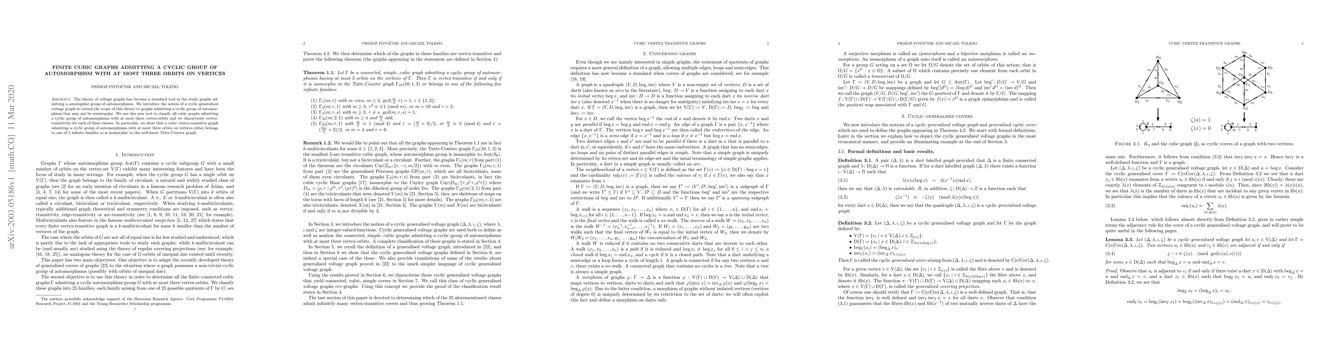 This paper introduces a cyclic generalised voltage graph concept to study cubic graphs with cyclic automorphism groups. It classifies all such cubic graphs with at most three vertex-orbits, showing they belong to 5 infinite families or the Tutte-Coxeter graph.