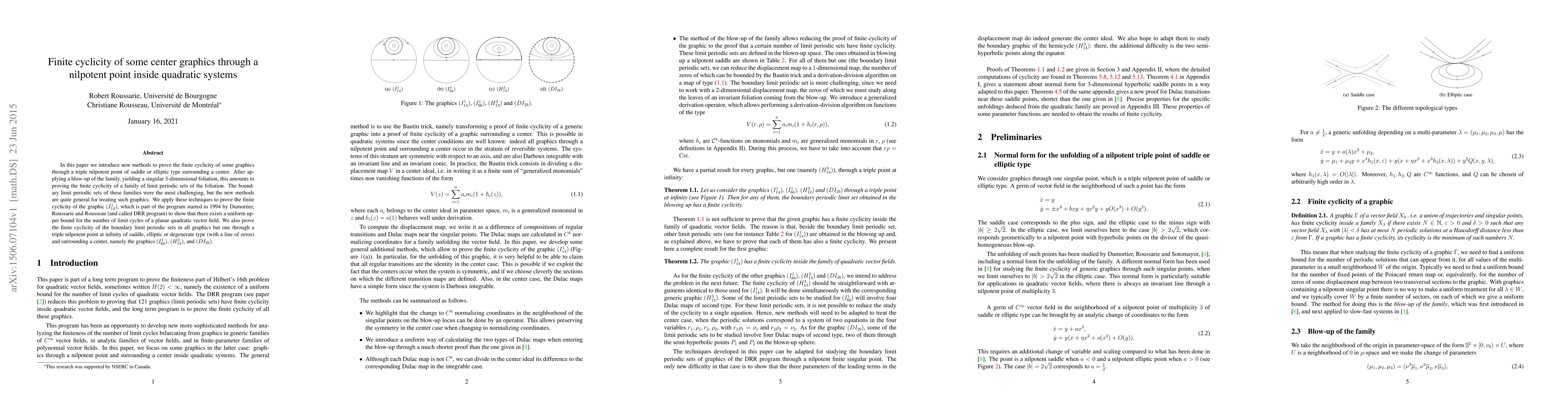 In this paper we introduce new methods to prove the finite cyclicity of some graphics through a triple nilpotent point of saddle or elliptic type surrounding a center. After applying a blow-up of the family, yielding a singular 3-dimensional foliation, this amounts to proving the finite cyclicity of a family of limit periodic sets of the foliation. The boundary limit periodic sets of these families were the most challenging, but the new methods are quite general for treating such graphics. We apply these techniques to prove the finite cyclicity of the graphic $(I_{14}^1)$, which is part of the program started in 1994 by Dumortier, Roussarie and Rousseau (and called DRR program) to show that there exists a uniform upper bound for the number of limit cycles of a planar quadratic vector field. We also prove the finite cyclicity of the boundary limit periodic sets in all graphics but one through a triple nilpotent point at infinity of saddle, elliptic or degenerate type (with a line of zeros) and surrounding a center, namely the graphics $(I_{6b}^1)$, $(H_{13}^3)$, and $(DI_{2b})$.