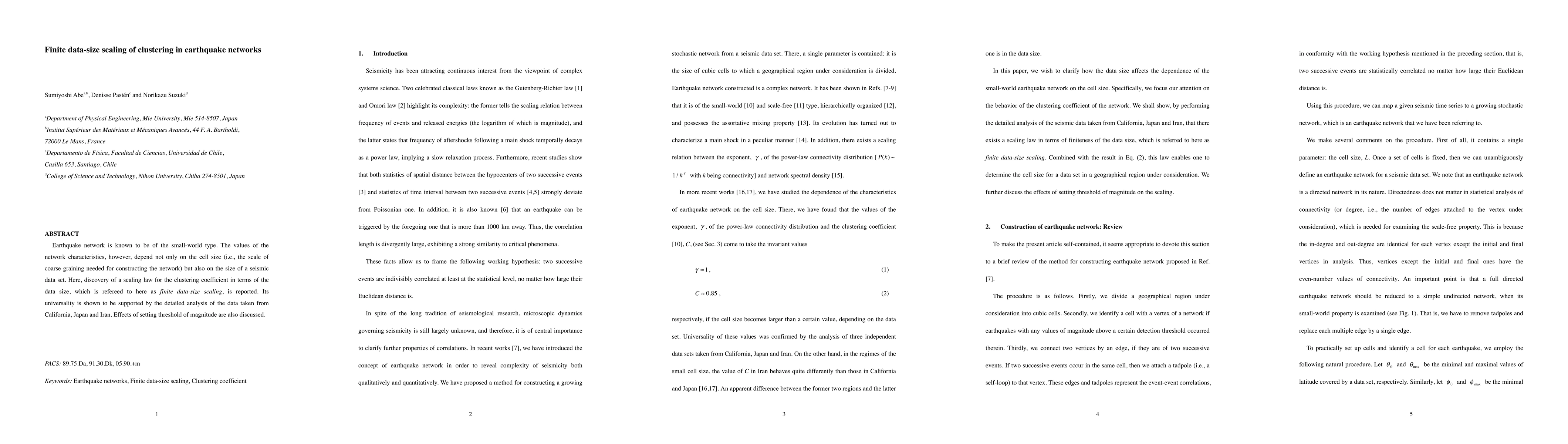 This paper investigates the finite data-size scaling of clustering in earthquake networks, revealing a scaling law for the clustering coefficient dependent on the size of the seismic dataset. The universality of this scaling is demonstrated through detailed analysis of earthquake data from California, Japan, and Iran, and the impact of varying magnitude thresholds is also examined.