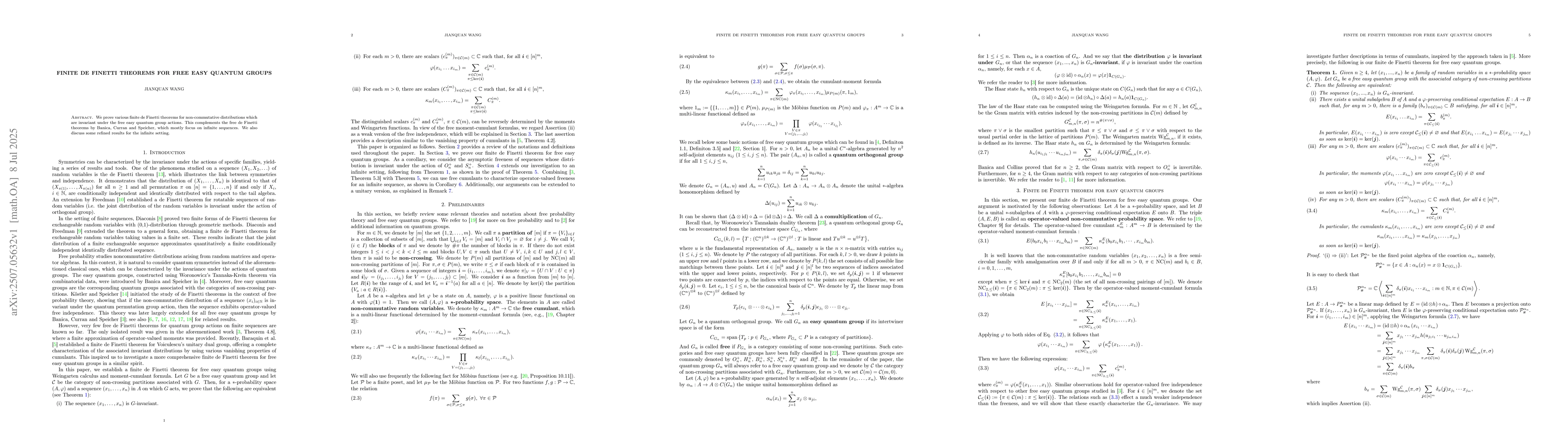 We prove various finite de Finetti theorems for non-commutative distributions which are invariant under the free easy quantum group actions. This complements the free de Finetti theorems by Banica, Curran and Speicher, which mostly focus on infinite sequences. We also discuss some refined results for the infinite setting.