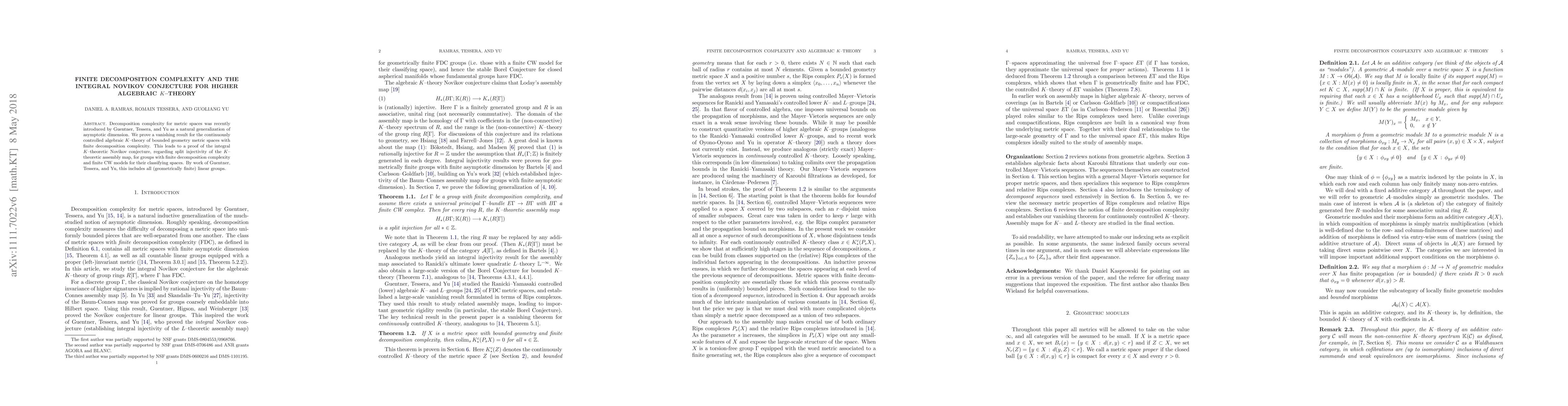 Decomposition complexity for metric spaces was recently introduced by Guentner, Tessera, and Yu as a natural generalization of asymptotic dimension. We prove a vanishing result for the continuously controlled algebraic K-theory of bounded geometry metric spaces with finite decomposition complexity. This leads to a proof of the integral K-theoretic Novikov conjecture, regarding split injectivity of the K-theoretic assembly map, for groups with finite decomposition complexity and finite CW models for their classifying spaces. By work of Guentner, Tessera, and Yu, this includes all (geometrically finite) linear groups.