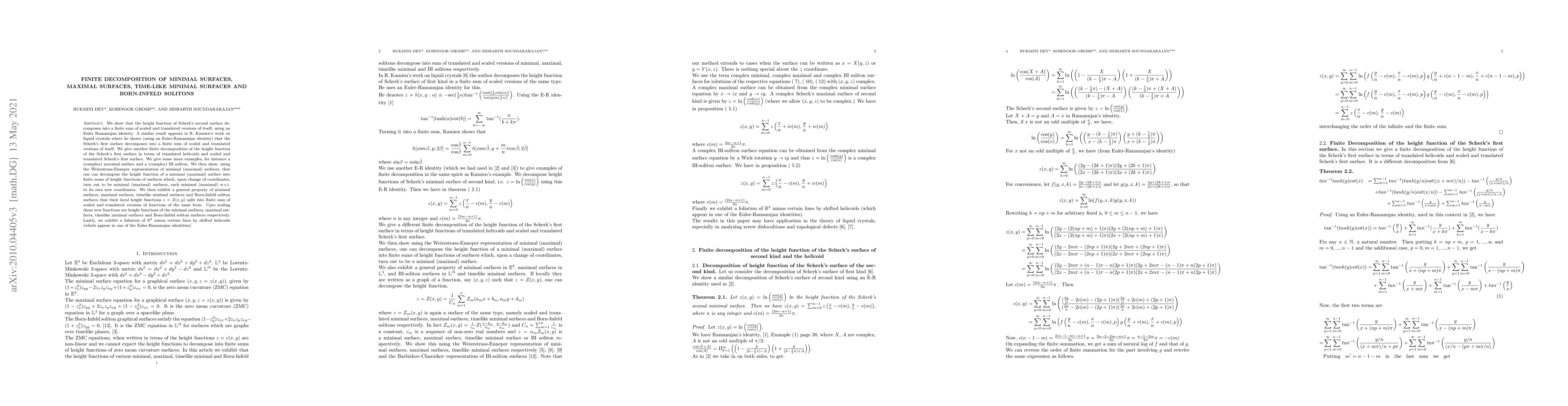 We show that the height function of Scherk's second surface decomposes into a finite sum of scaled and translated versions of itself, using an Euler Ramanujan identity. A similar result appears in R. Kamien's work on liquid crystals where he shows (using an Euler-Ramanujan identity) that the Scherk's first surface decomposes into a finite sum of scaled and translated versions of itself. We give another finite decomposition of the height function of the Scherk's first surface in terms of translated helicoids and scaled and translated Scherk's first surface. We give some more examples, for instance a (complex) maximal surface and a (complex) BI soliton. We then show, using the Weierstrass-Enneper representation of minimal (maximal) surfaces, that one can decompose the height function of a minimal (maximal) surface into finite sums of height functions of surfaces which, upon change of coordinates, turn out to be minimal (maximal) surfaces, each minimal (maximal) w.r.t. to its own new coordinates. We then exhibit a general property of minimal surfaces, maximal surfaces, timelike minimal surfaces and Born-Infeld soliton surfaces that their local height functions $z=Z(x,y)$ split into finite sum of scaled and translated versions of functions of the same form. Upto scaling these new functions are height functions of the minimal surfaces, maximal surfaces, timelike minimal surfaces and Born-Infeld soliton surfaces respectively. Lastly, we exhibit a foliation of ${\mathbb R}^3$ minus certain lines by shifted helicoids (which appear in one of the Euler-Ramanujan identities).