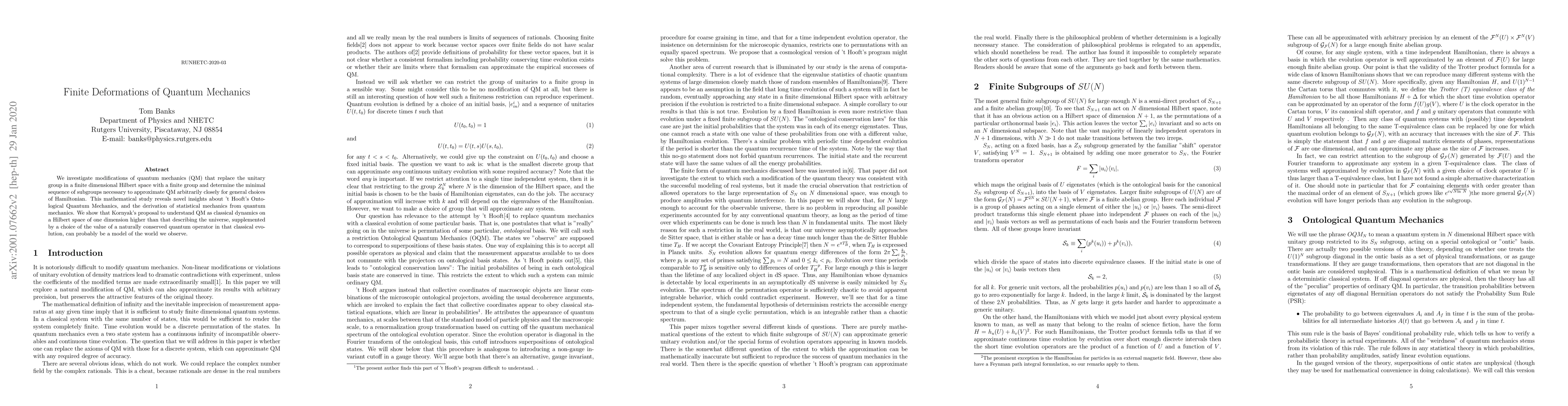 We investigate modifications of quantum mechanics (QM) that replace the unitary group in a finite dimensional Hilbert space with a finite group and determine the minimal sequence of subgroups necessary to approximate QM arbitrarily closely for general choices of Hamiltonian. This mathematical study reveals novel insights about 't Hooft's Ontological Quantum Mechanics, and the derivation of statistical mechanics from quantum mechanics. We show that Kornyak's proposal to understand QM as classical dynamics on a Hilbert space of one dimension higher than that describing the universe, supplemented by a choice of the value of a naturally conserved quantum operator in that classical evolution can probably be a model of the world we observe.