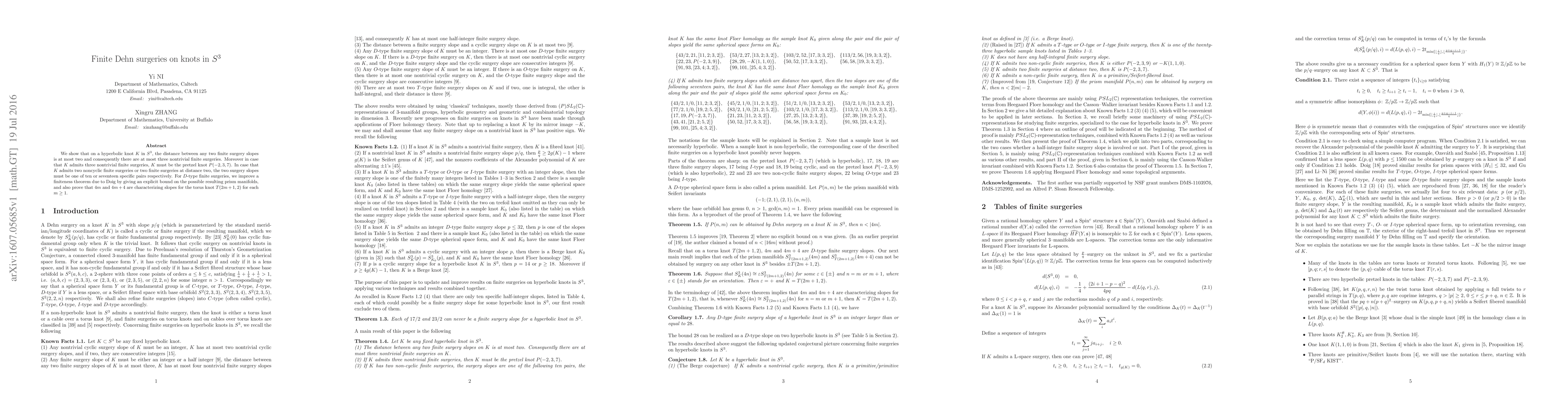 We show that on a hyperbolic knot $K$ in $S^3$, the distance between any two finite surgery slopes is at most two and consequently there are at most three nontrivial finite surgeries. Moreover in case that $K$ admits three nontrivial finite surgeries, $K$ must be the pretzel knot $P(-2,3,7)$. In case that $K$ admits two noncyclic finite surgeries or two finite surgeries at distance two, the two surgery slopes must be one of ten or seventeen specific pairs respectively. For $D$-type finite surgeries, we improve a finiteness theorem due to Doig by giving an explicit bound on the possible resulting prism manifolds, and also prove that $4m$ and $4m+4$ are characterizing slopes for the torus knot $T(2m+1,2)$ for each $m\geq 1$.