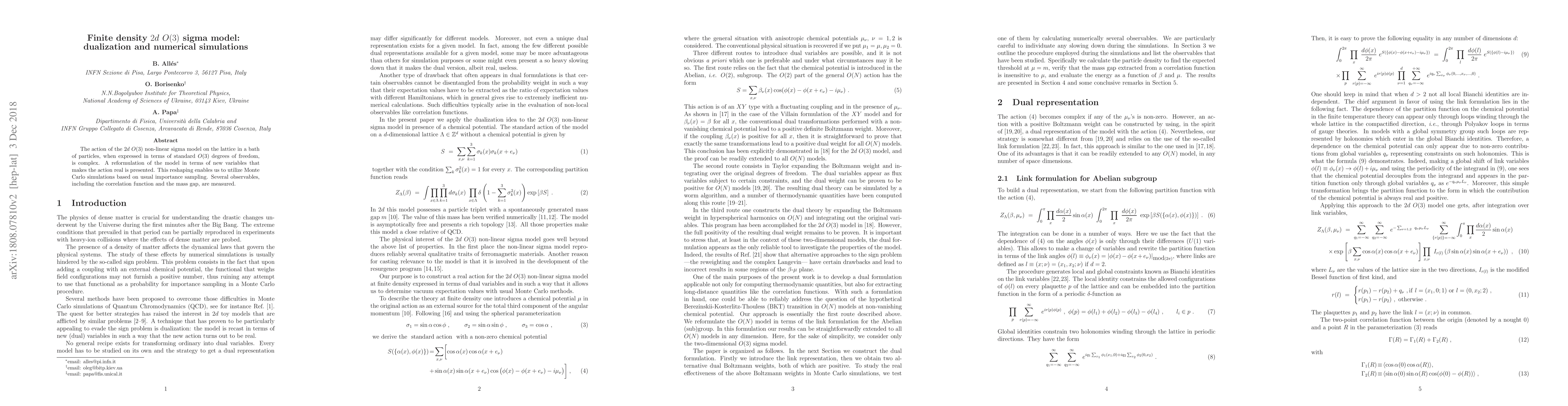 This paper reformulates the finite density 2d O(3) sigma model to make its action real, enabling Monte Carlo simulations. Numerical simulations measure observables like correlation functions and mass gaps.