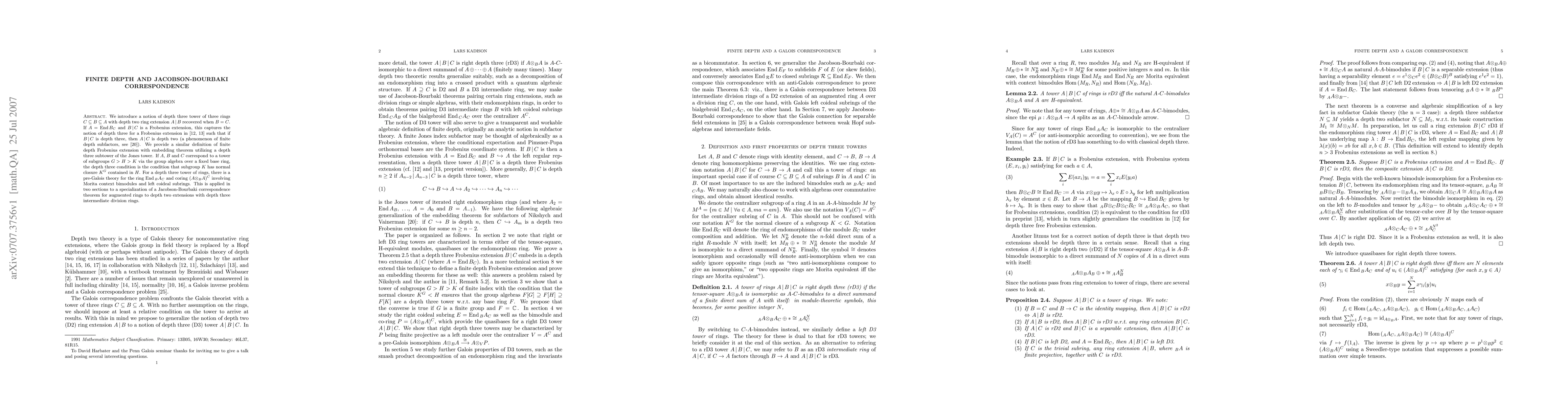 We introduce a notion of depth three tower of three rings C < B < A with depth two ring extension A | B recovered when B = C. If A = \End B_C and B | C is a Frobenius extension, this captures the notion of depth three for a Frobenius extension in arXiv:math/0107064 and arXiv:math/0108067, such that if B | C is depth three, then A | C is depth two (a phenomenon of finite depth subfactors, see arXiv:math/0006057). We provide a similar definition of finite depth Frobenius extension with embedding theorem utilizing a depth three subtower of the Jones tower. If A, B and C correspond to a tower of subgroups G > H > K via the group algebra over a fixed base ring, the depth three condition is the condition that subgroup K has normal closure K^G contained in H. For a depth three tower of rings, there is a pre-Galois theory for the ring \End {}_BA_C and coring (A \o_B A)^C involving Morita context bimodules and left coideal subrings. This is applied in two sections to a specialization of a Jacobson-Bourbaki correspondence theorem for augmented rings to depth two extensions with depth three intermediate division rings.