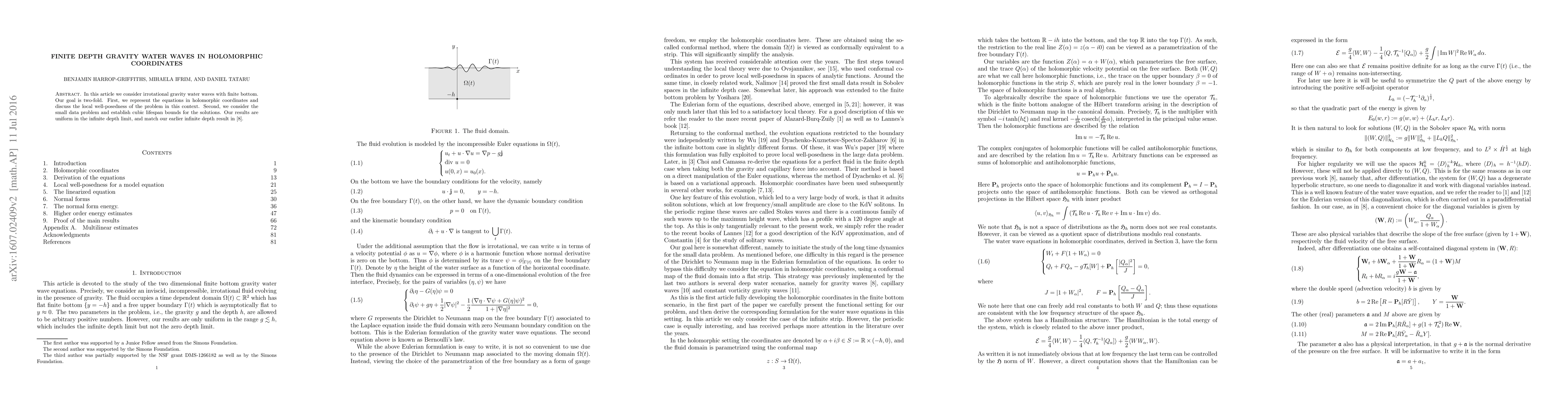 This paper studies irrotational gravity water waves with finite depth, representing the equations in holomorphic coordinates and discussing local well-posedness. It also establishes cubic lifespan bounds for small data solutions, with results uniform in the infinite depth limit, matching previous infinite depth findings.