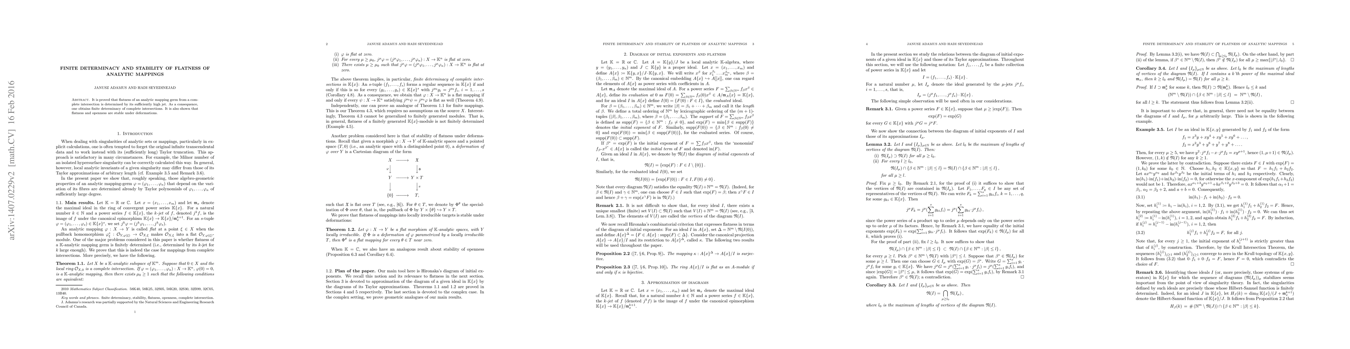 An analytic mapping germ from a complete intersection has finite determinacy of flatness if its jet is sufficiently high, leading to stable flatness and openness under deformations.