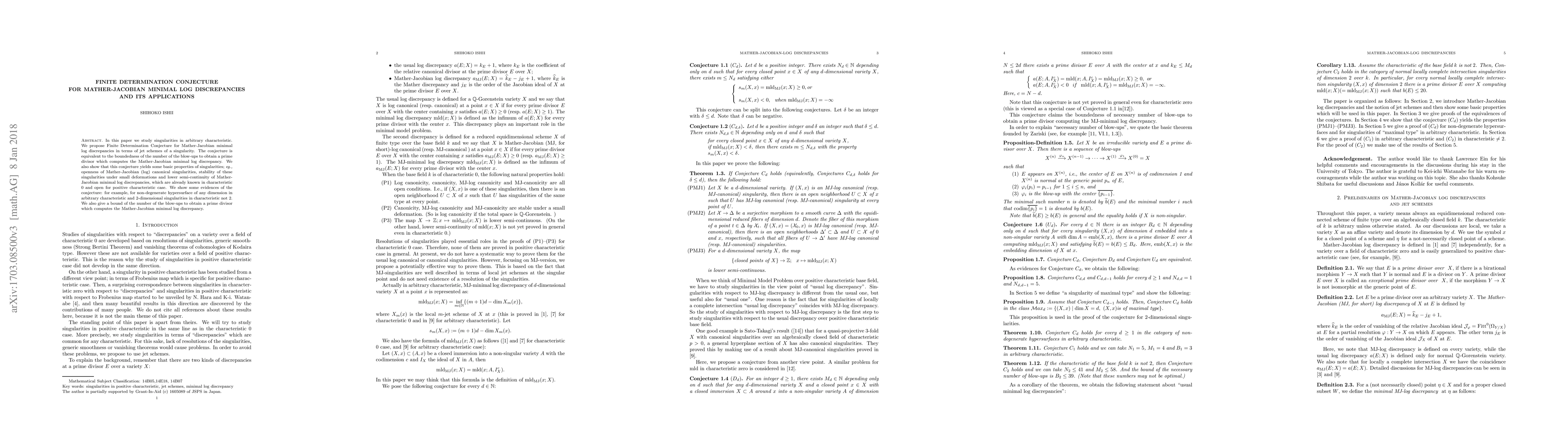 This paper proposes a Finite Determination Conjecture regarding Mather-Jacobian minimal log discrepancies in arbitrary characteristic, suggesting boundedness in the number of blow-ups needed to compute these discrepancies. The conjecture also implies known properties of singularities in characteristic 0, extending them to positive characteristic cases.