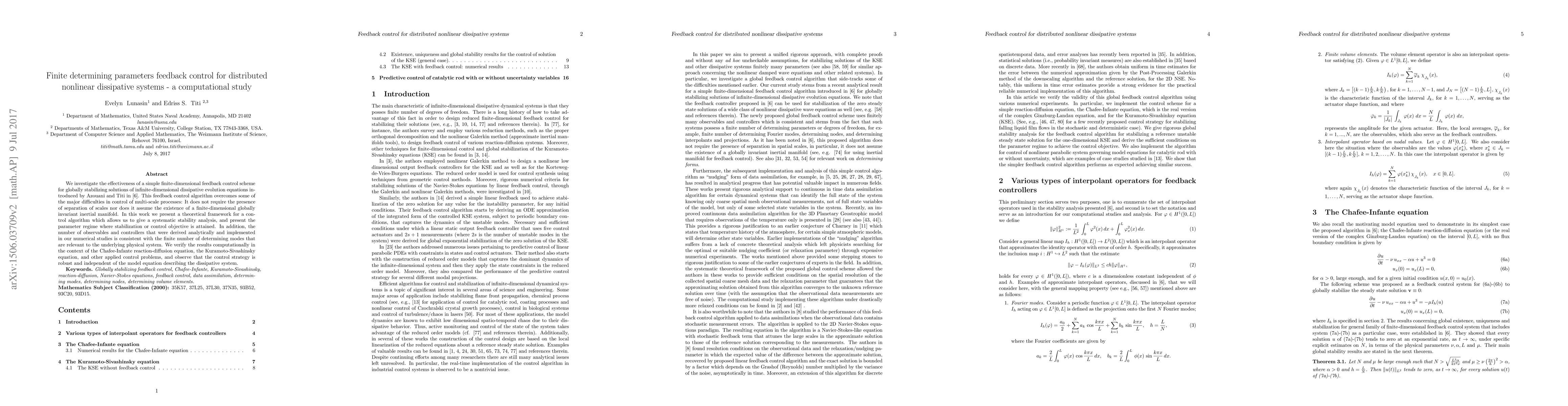 This paper presents a computational study on a finite-dimensional feedback control algorithm for stabilizing solutions of infinite-dimensional dissipative evolution equations, using a finite number of determining parameters. It demonstrates the effectiveness of the scheme for stabilizing the unstable zero solution of the 1D Chafee-Infante and Kuramoto-Sivashinsky equations, with rigorous stability analysis and derived conditions for control parameters.